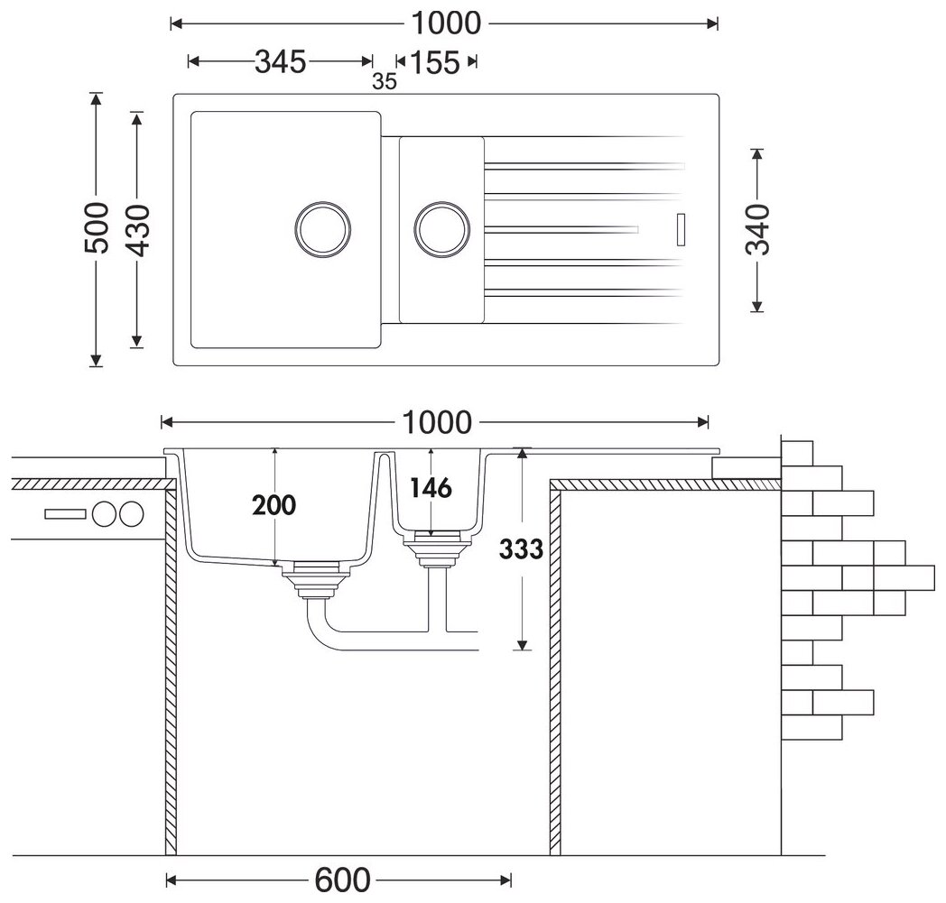 Built-in sink. Composite, with draining surface and half sink, reversible. 3½" basket strainer valve flush with rotational excenter fitting, chrome-plated. Half sink closeable.