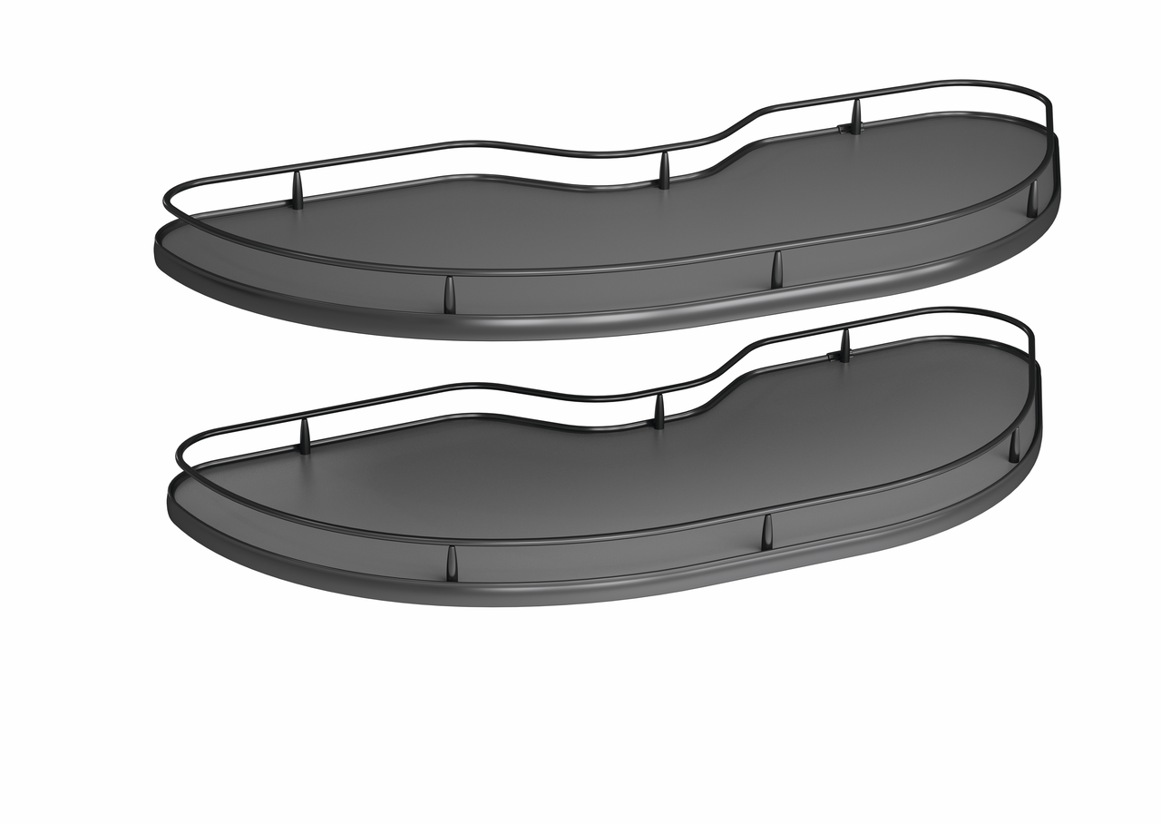 The Cornerstone Maxx shelf set with railing is designed to make optimum use of the storage space in kitchen corner cabinets. Thanks to the special shape, it is easy to access food supplies, spice jars and other utensils after opening the door. The two height-adjustable shelves can be extended straight out separately from each other, so that the neighbouring base unit can be used at the same time. The all-round railing prevents objects from falling. The shelf element is fitted in combination with the Cornerstone Maxx corner unit swivel fitting. Selected in the desired version, the fitting is attached to the left or right side as required. In terms of appearance and size, various versions are available to match the respective corner cabinets.
