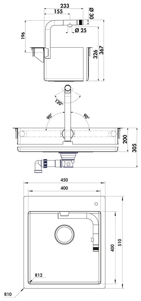Built-in sink. 3½" basket strainer valve flush with push-button excenter fitting. With single-lever mixer integrated into the bowl wall, stainless steel finish, swivel spout 180°, 120° rotating.