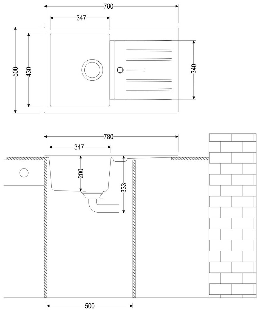 Built-in sink. Composite, with small draining surface, reversible. 3½" basket strainer valve flush with rotational excenter fitting, chrome-plated.