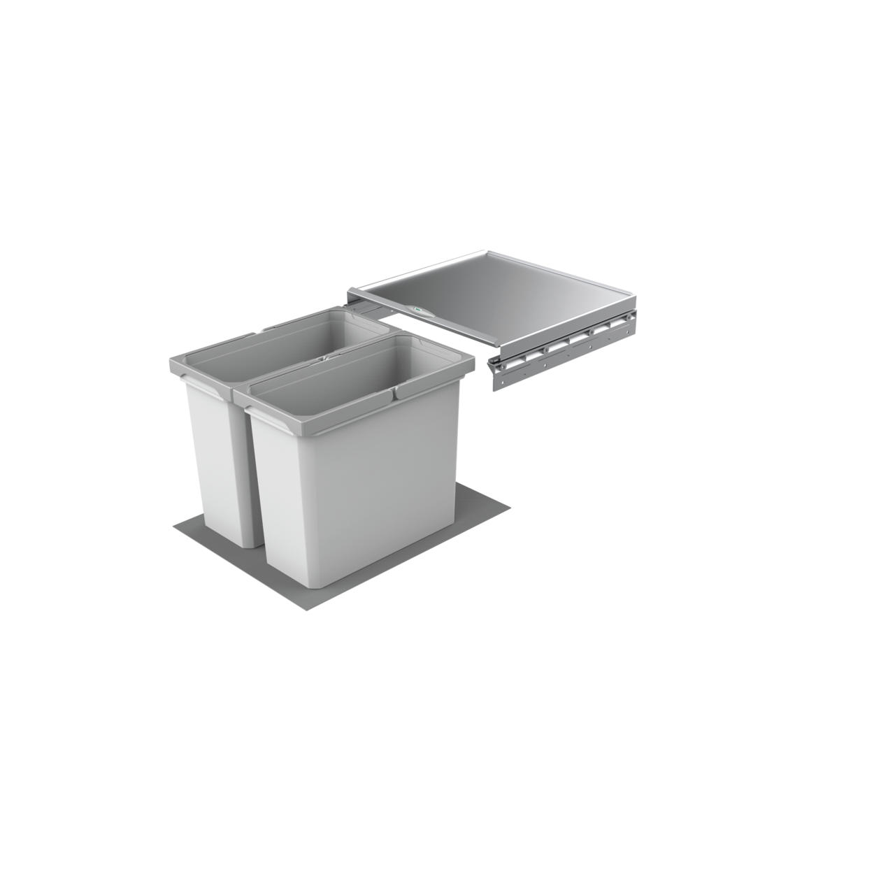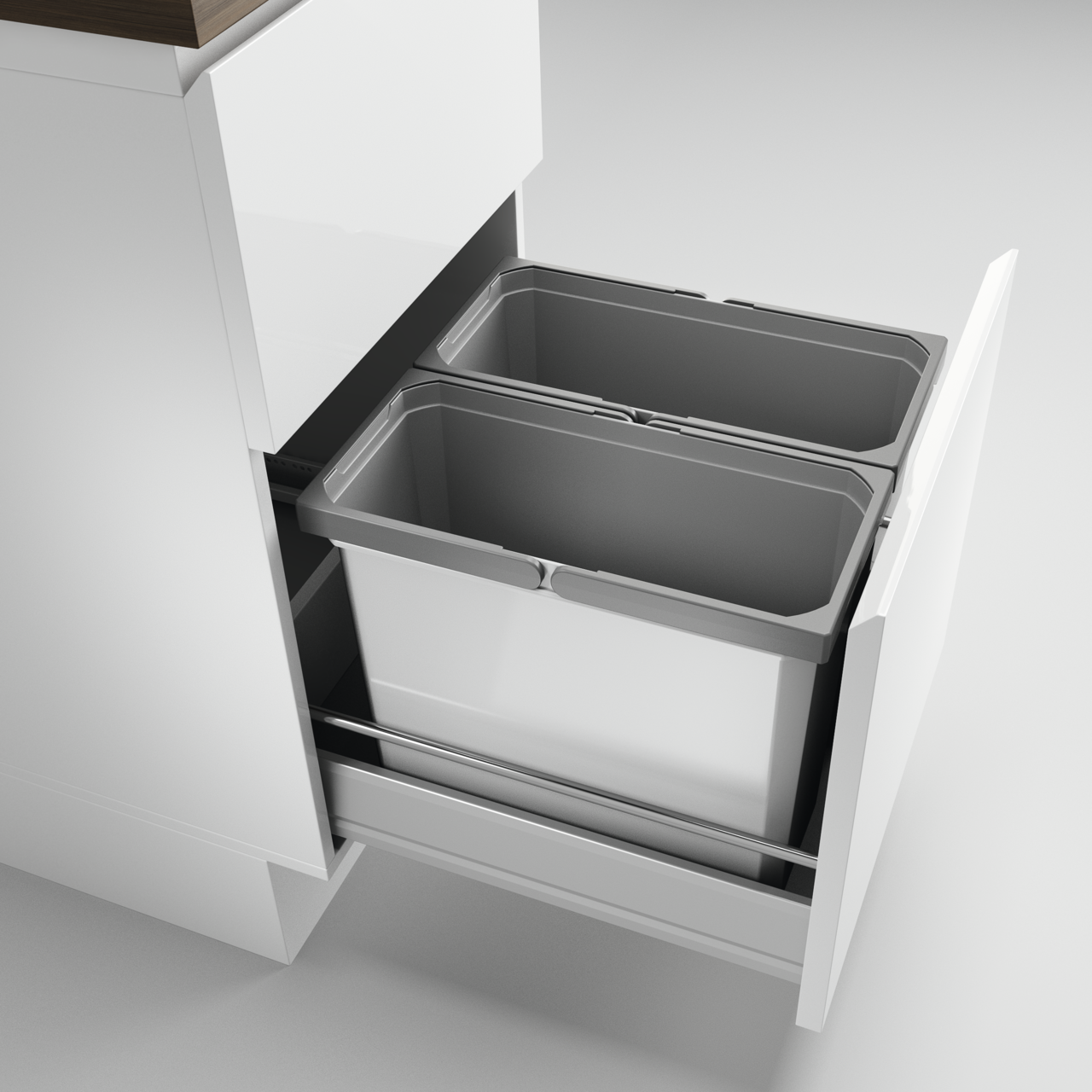 The waste separation system Cox® Box 360 S/450-2 proves to be a real enrichment for everyday kitchen life thanks to various features and is designed for existing pull-outs. To collect recyclables and separate them in a targeted manner, it has two waste bins with a volume of 16 litres each. The pull-out overall metal lid closes the inner bins and protects the kitchen from unpleasant odours. If required, it can also be used as an additional storage surface for various utensils. Alternatively, the waste bin can be stored behind the top front to save space. For installation in pull-outs, the waste separation system is equipped with an anti-slip mat coated on both sides, which allows it to stand securely without slipping.