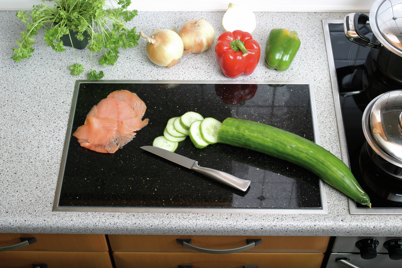 The rectangular Decotop 2 granite worktop creates a clever work surface for preparing food or for placing hot cooking pots. It is intended for permanent installation in the kitchen worktop. It can also be used for damaged worktops. It is equipped with a matching stainless steel surround that forms the elegant frame. The smooth surface with the Galaxy Star motif proves to be insensitive and easy to clean. With its dimensions of 496 x 311 mm, the granite panel is equally suitable for kitchen islands and wall solutions. The installation depth is 13 mm.