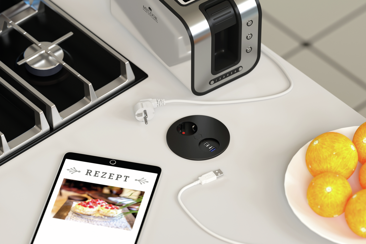 Socket element. Single and double USB A+C charger (charging station). Electric opening at the push of a button.