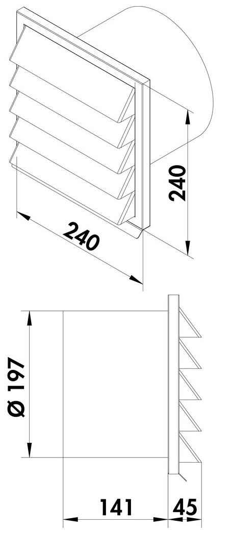 240 x 240 mm with backpressure shutter for connection to round pipe.