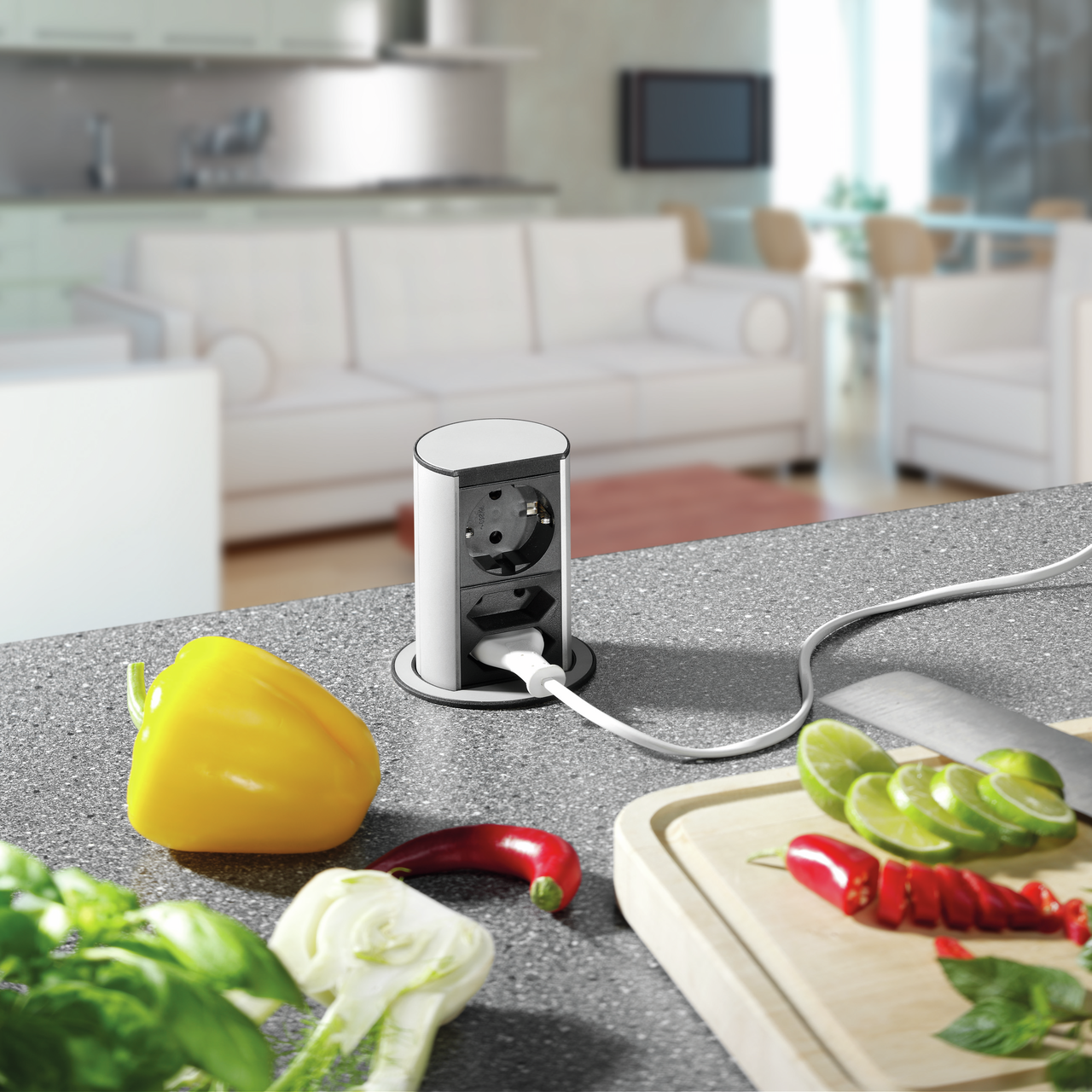 The CON-AKTIV® Elevator 3 retractable socket outlet puts power connections in the kitchen where they are still needed. The elegant socket element equips worktops, especially on kitchen islands, with power. It has a semi-circular, classic design with stainless steel-coloured, brushed trim. The socket outlet is equipped with a total of three slots arranged one above the other, one of which is a protective contact socket and two of which are Euro flat sockets. If the 3-way socket outlet is not needed at the moment, it fits almost flush into the work surface. A light press on the housing cover is all it takes for the unit to slide out via a clever spring mechanism. In this way, the multiple socket provides a convenient and safe power supply for kitchen appliances that are not in permanent use. The connecting cable with the Schuko plug included in the set offers sufficient scope for installation. The cable outlet is located at the bottom. When planning, the installation depth for pull-outs and drawers must be taken into account. While the socket insert is made of black plastic, the profile is made of aluminium. The socket strip is mounted quickly and easily using a screw ring, so that installation can also be done retrospectively.
