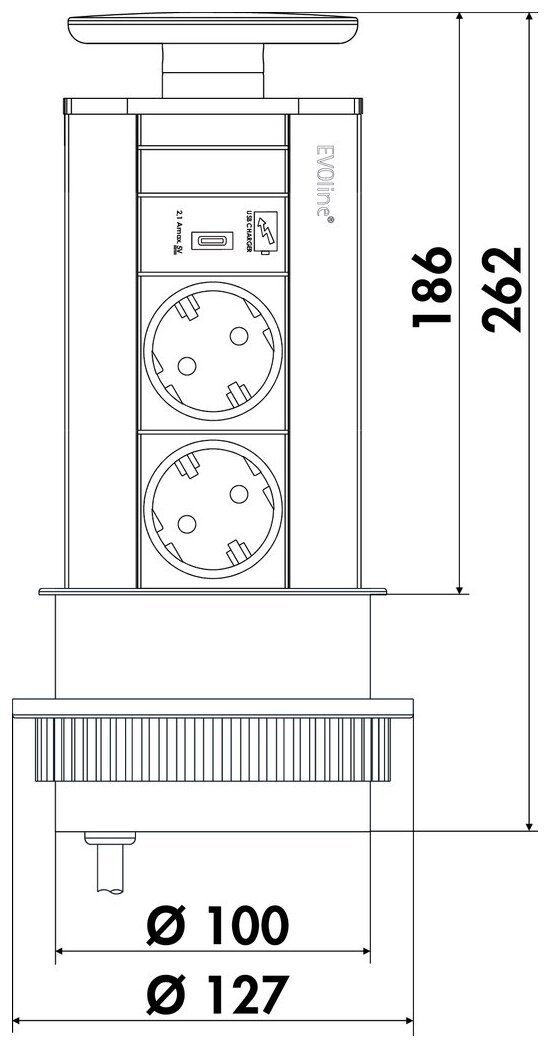 Energy box. Concealed. With 2 sockets and 1 USB charger (charging station) for wall-mounted cabinets or worktops. Easy, guided extraction thanks to an easy-to-press button which also guides the cable neatly when reclosing.
