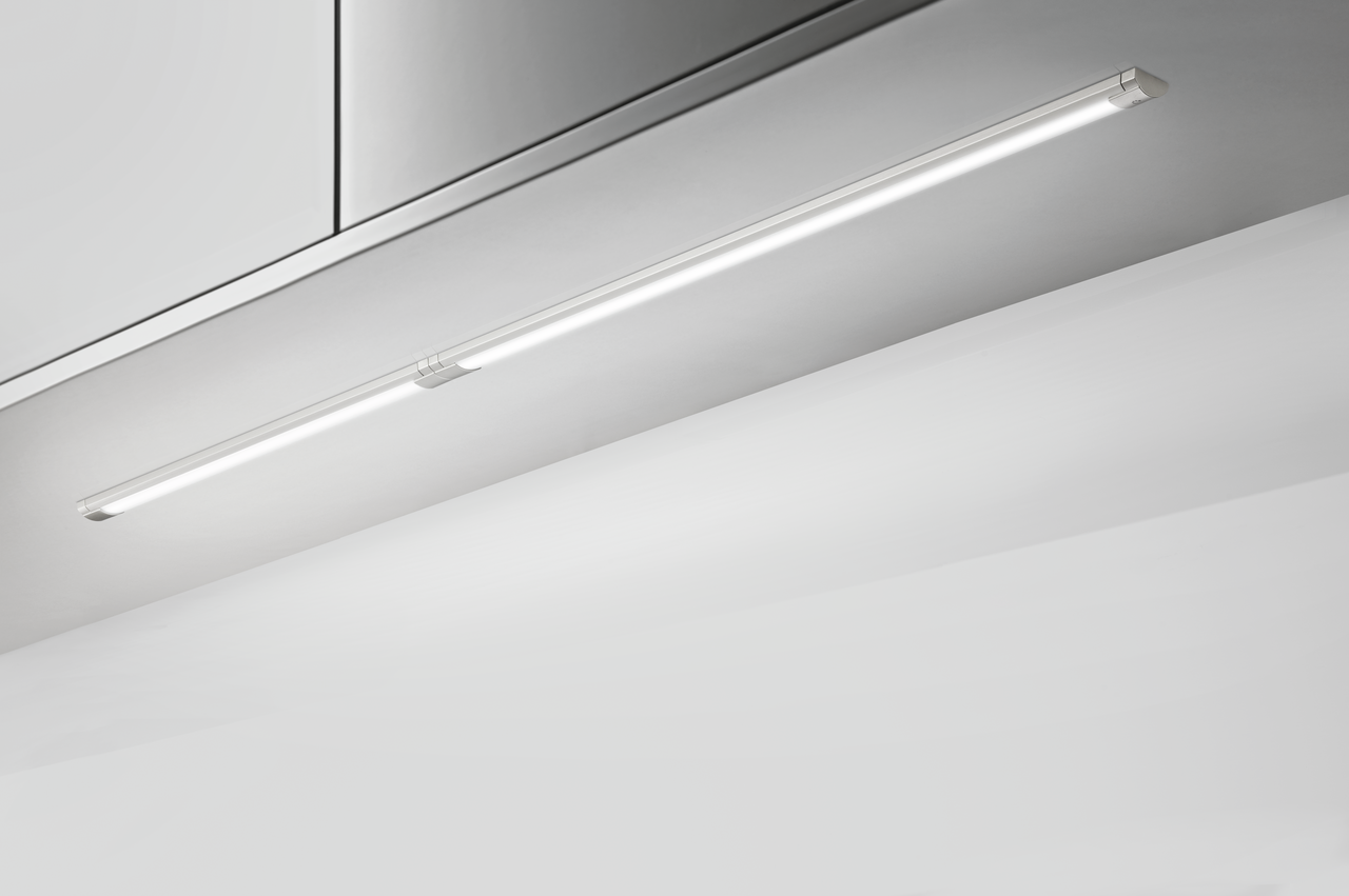 The Feel LED under-cabinet luminaire provides comfortable illumination of the work area inside the kitchen unit without visible LED light points. With its elegant design, it is perfect for mounting on the underside of wall cabinets and blends harmoniously into modern kitchen architecture. The luminaire is equipped with a touch switch, so a short touch is enough to switch it on and off. A longer touch activates the dimming function to adjust the brightness continuously. The light emitted corresponds to a neutral white tone with 4300 K and has a maximum radiant power of 85 lumens per watt. The under-cabinet luminaire can be easily extended to illuminate larger areas using the connecting cables integrated in the housing caps. A supply line required for the power supply is included in the overall package and can be integrated on both sides. The matching LED converter is available separately as an accessory.