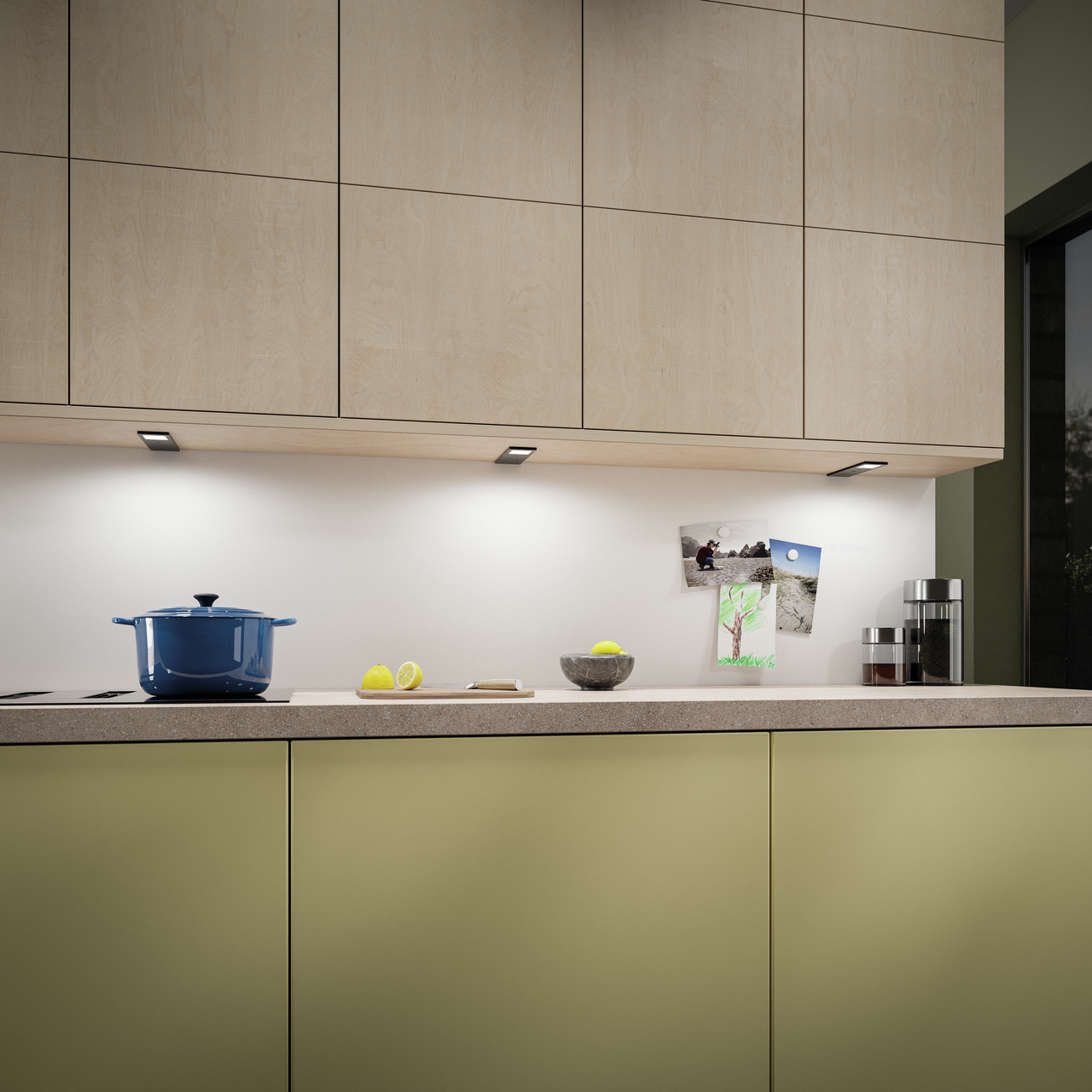 The Forato LED under-cabinet luminaire in matt black is housed in an aluminium casing and blends harmoniously into contemporary kitchen architecture. Mounted on the underside of a wall cabinet, it provides pleasant illumination of the work area without visible LED light points. The light colour can be selected between a warm white tone for a rather relaxed ambience and a neutral white tone with a businesslike character. The brightness with a maximum of 85 lumens per watt is controlled continuously via the touch switch including dimming function. Practical sets with up to 6 luminaires enable the illumination of larger areas within the kitchen unit. In addition to the individual luminaire with switch, they also include an LED converter required for reliable operation. Thanks to its length, the power supply cable offers plenty of scope for installation. Connecting the LED luminaires is very easy with the aid of the connecting cables with mini plug-in system. Optionally, it is available as an accessory in an extra-long version to increase the distance between the individual luminaires.