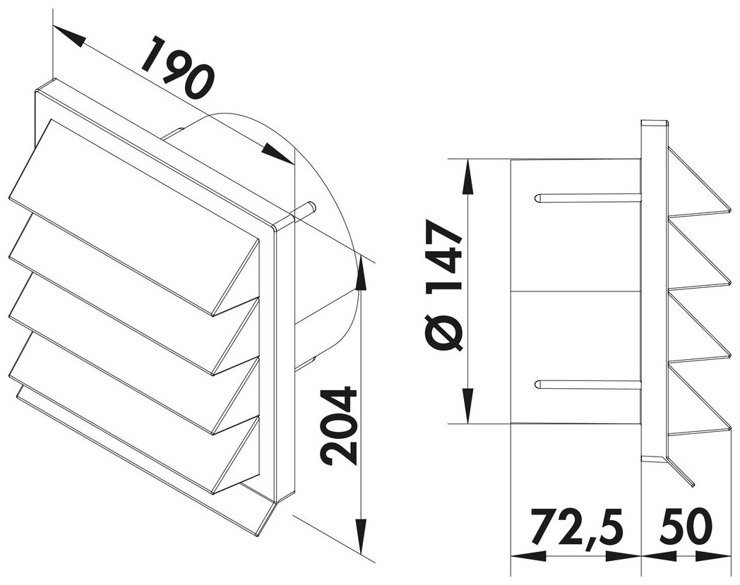 190 x 190 mm, with backpressure shutter for connection to round pipes.