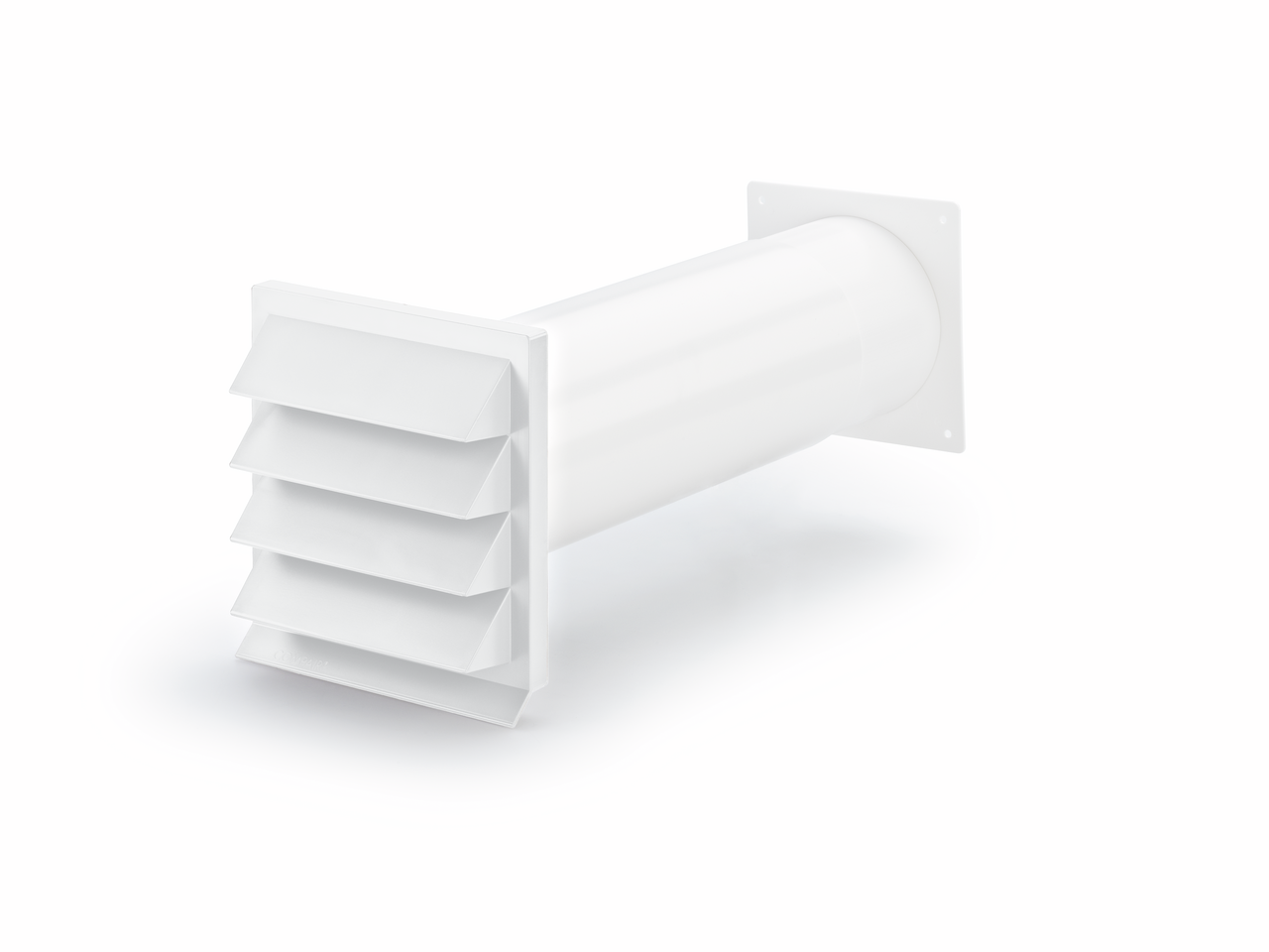 The COMPAIR® flow K-Klima-R 125/125 wall box provides an effective wall duct for the extract air system. The patented COMPAIR® flow air duct system with integrated air guide bodies in transition pieces and horizontal bends transports the exhaust air quietly and with low pressure loss to the outside. The wall duct is suitable for connecting round pipes. With a pipe diameter of 125 mm, a wall opening of approx. 132 mm is required. The telescopic pipe allows the length of the feed-through to be adjusted from 420-620 mm depending on the wall thickness. In addition, the pipe can easily be shortened to a length of up to 100 mm. The existing backflow flap prevents air from the outside from entering the kitchen through the pipe. For additional protection against the weather, the telescopic wall duct is equipped with a high-quality external louvre in a louvre design. As it is available in several colours, it offers scope for personal design wishes.