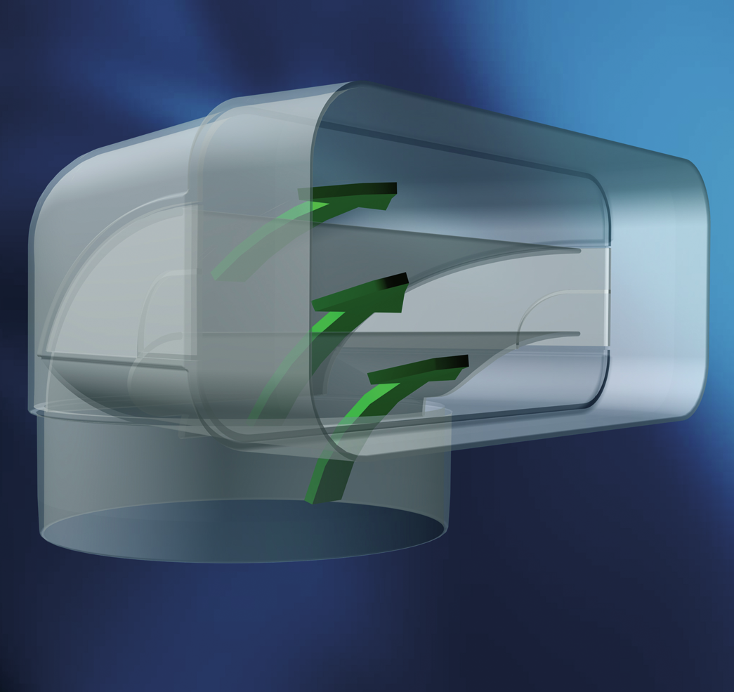 The COMPAIR® flow MF-RBV 125 vertical pipe bend with moulded sockets on both sides enables the direction of the air flow in air ducts to be changed at an angle of 90°. The integrated air baffles enable optimum flow behaviour with low pressure losses. For an easy and reliable connection with a universal connector, the ventilation moulding has a latching element.