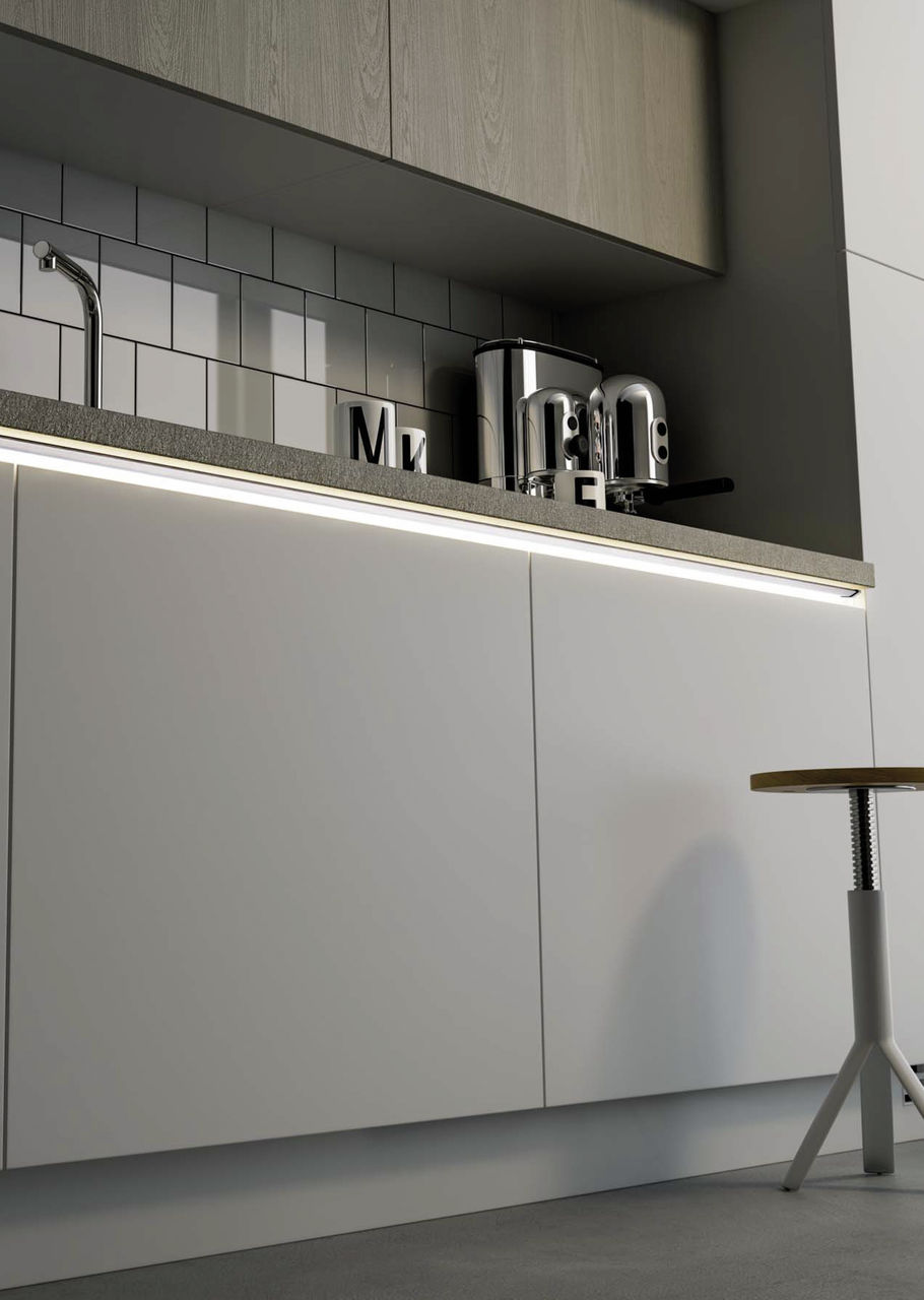 The Manubrio LED profile with colour change creates individual ambient lighting in the kitchen. It is specially designed for handle strips and is attached directly to the handle edge of the base cabinets using retaining clips. This creates effective lighting accents in the room. The LED light consists of a stainless steel-coloured plastic housing and a self-adhesive LED strip that can be shortened every 50 mm. The satin-finished profile cover ensures that the surface is evenly illuminated without visible LEDs. The ambient light can be continuously adjusted within a range of 2700 to 6500 K. This corresponds to a colour temperature ranging from warm white to daylight white. The integrated light source has an output of 7.8 W per metre with up to 80 lumens per watt. A 200 cm long supply cable on both sides allows for easy installation. Four end caps are included in the scope of delivery. The individual light is available in different lengths. Additional angles and connectors are available as accessories. The cabinet light is compatible with the separately available components of the smart LUMICA LIC/MEC LED system, which enables individual control from a fingertip to a voice command.