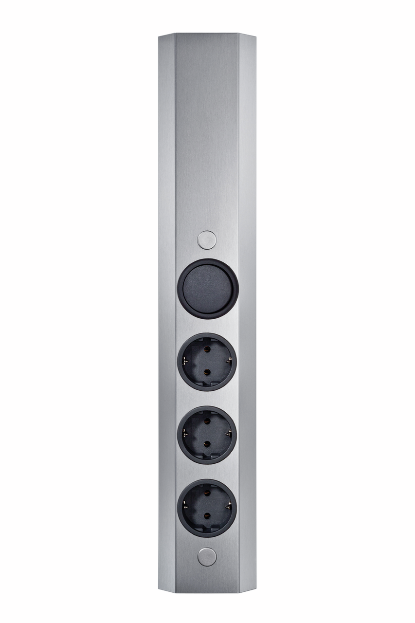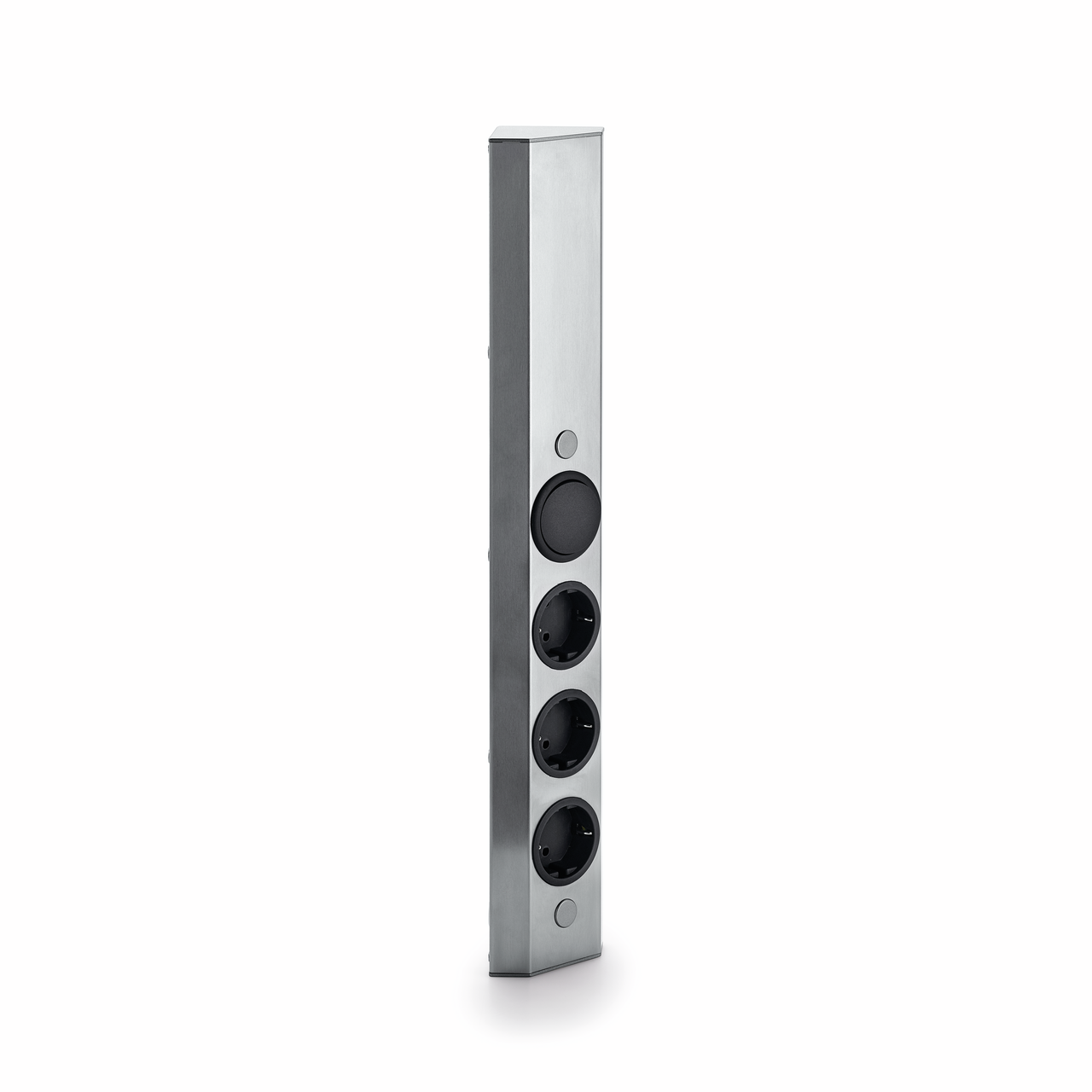 The CON-AKTIV® Mira Eck small S corner socket convinces with its elegant design and compact construction. With its slim shape, it can be integrated into the kitchen corner on the worktop or underneath the wall cupboard to save space. The timeless stainless steel look blends in harmoniously with the existing kitchen furnishings. To ensure that the 3-way socket outlet can be optimally adjusted to the height between the worktop and wall unit, it has a telescopic compensating piece. To power the toaster, kettle and other kitchen appliances, three sockets are positioned one below the other. For external lighting, the socket element is equipped with an additional switch. Installation in the corner of the kitchen is uncomplicated and quick. The multiple socket is made of durable and robust quality. The cable outlet from the rear allows the cable to be connected flat against the wall. A suitable Schuko plug is supplied loose. The corner socket element is available in different colours and can be ordered to match the interior style.
