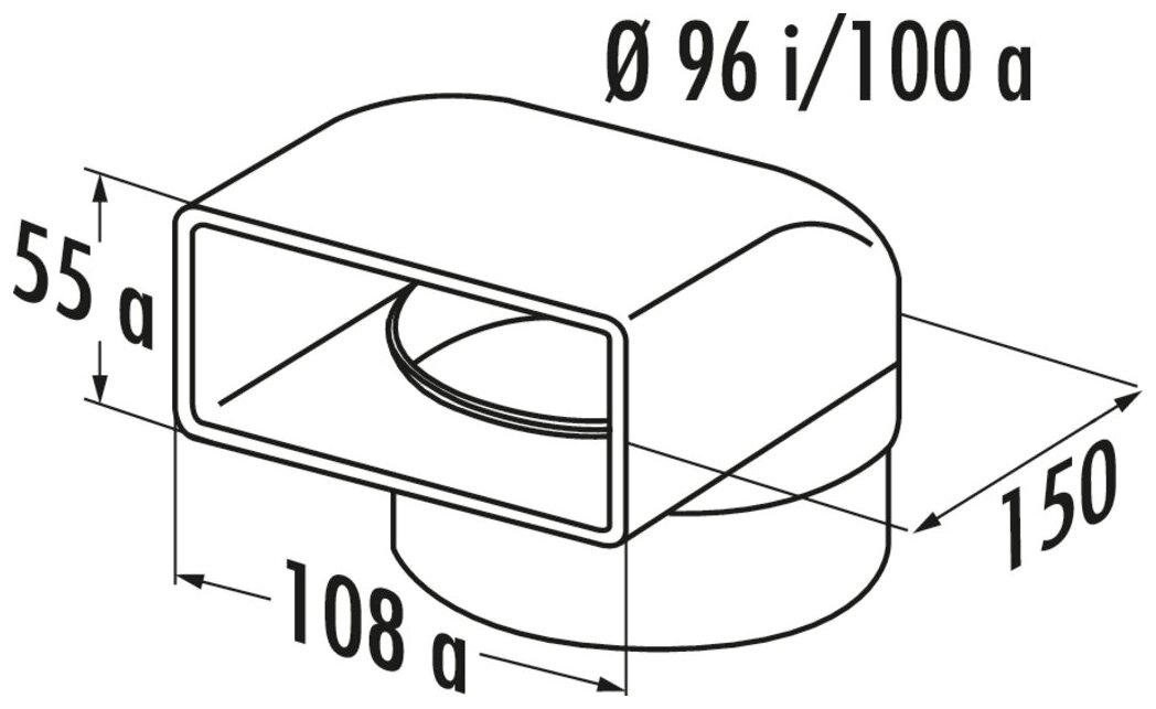 The flexible COMPAIR® norm N-UR 8 System 100 deflection piece enables the uncomplicated connection of a flat duct pipe with a round pipe or Flex duct. At the same time, it provides a vertical bend of 90° to create a change of direction within the exhaust or supply air duct in the kitchen. The fitting is suitable for connecting flat ducts with a cross-section of 108 x 55 mm with a socket and round ducts with a diameter of 150 mm. For this purpose, it is equipped with an 80 mm long pipe socket.