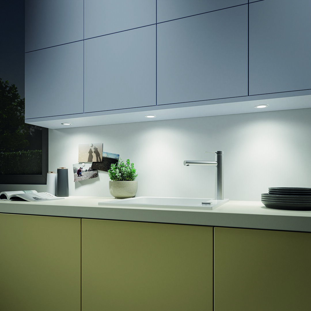 Whether for illuminating small niches or work surfaces: The Need LED recessed spotlight can be used to create targeted lighting accents in the kitchen. It relies on a modern design and convinces with a simple stainless steel look. Thanks to its round shape, the LED luminaire can be integrated into all room concepts. Thanks to the multiple mounting options, it can be attached to the ceiling, wall or also to wall cabinets. The LED technology used ensures direct and precise light distribution and does not heat up illuminated objects. Low energy consumption and a long burning time are also among its advantages. When illuminated, the recessed spotlight produces a continuous light without visible LED points. With its neutral white light colour of 4300 K, it provides bright and at the same time pleasant lighting conditions in the room. The recessed spotlight is supplied without a switch. Accessories such as an LED converter and LED connecting cable can be ordered optionally.