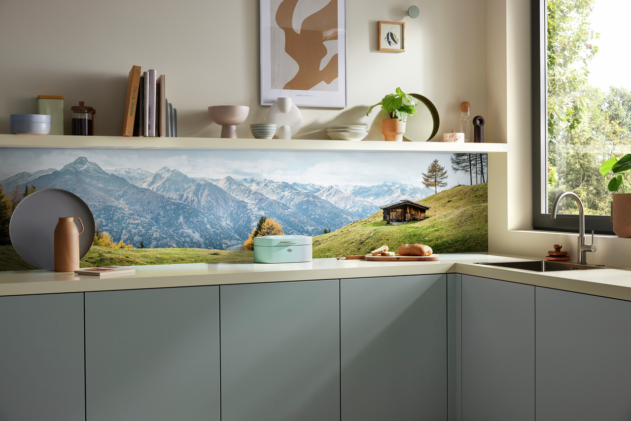 Thanks to the stylishly minimalist colour scheme, the high-quality digital print blends harmoniously into the planned kitchen architecture. Equipped with a UV print protection laminate, it is characterised by durable and easy-care properties. The format and cut-out can be freely defined within the maximum size of 3050 mm and a width of 700 mm using the Naber niche splashback configurator. Further selection options include material and material thickness as well as the preferred surface design. The range of PICit® niche designs includes a large selection of creative motifs and is complemented by the RAL colours from the BASICit® range. Attractive MySCENEit® unique items are created by uploading the customer's personalised motifs to the configurator.