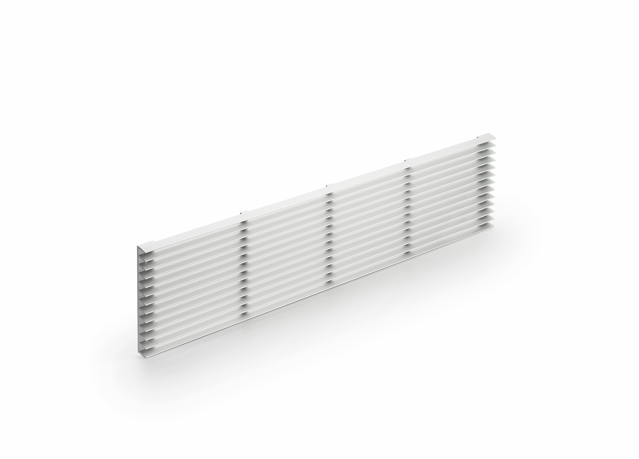 Slatted ventilation grid in aluminium. Can be used as a return flow opening in case of circulating air units positioned in the base. The necessary cross-section area for the passage of air specified by the hood manufacturer is to be observed! This results in the number of grids required. Installation is carried out by screwing in front of the base cut-out.