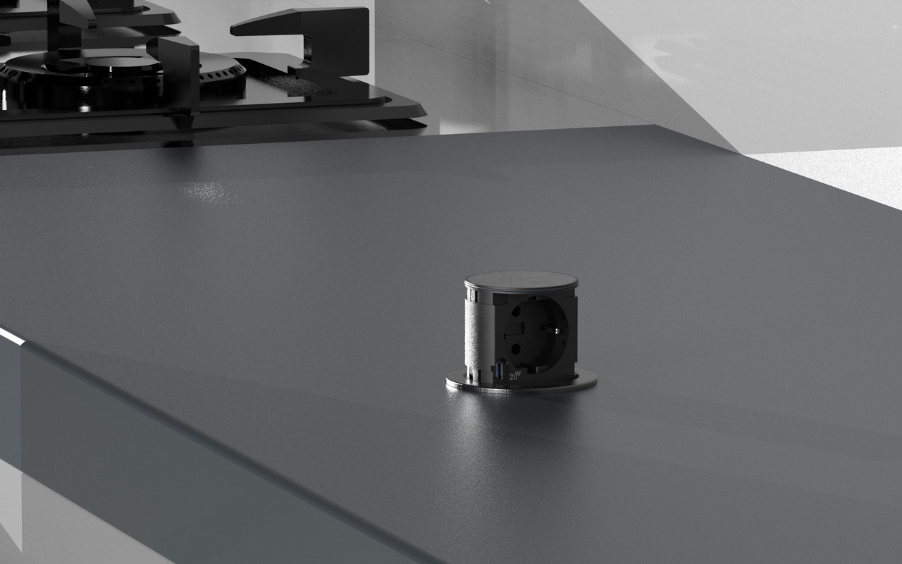 The CON-AKTIV®Piccolino socket with retractable technology is discreet and effective. It is ideal for installation in worktops on kitchen islands. The socket element offers convenient and safe connection for kitchen appliances that are not in constant use. With its elegant oval design, it blends harmoniously into many interior design concepts. When closed, it forms a level surface with the worktop. When needed, a light press on the cover is enough to activate the integrated spring mechanism, which raises the housing. The retractable socket then provides two Schuko sockets, which are arranged side by side. This means that the double socket only requires a shallow installation depth of less than 48 mm. This has a positive effect on the space required if there are drawers or pull-outs underneath. The cable outlet on the underside should also be taken into account during installation. A 200 cm long mains connection cable including a Schuko plug is included. This allows the double socket to be supplied with power directly, for example via a floor socket. The material used is durable and easy-care plastic. There are different cover designs to choose from.