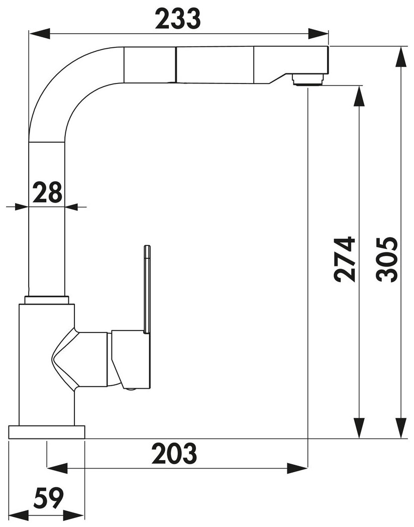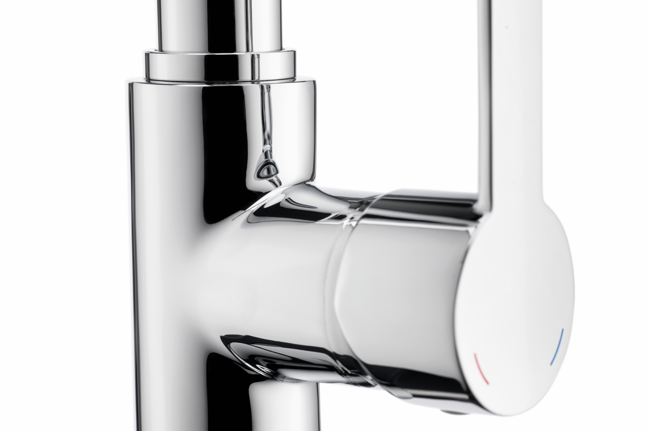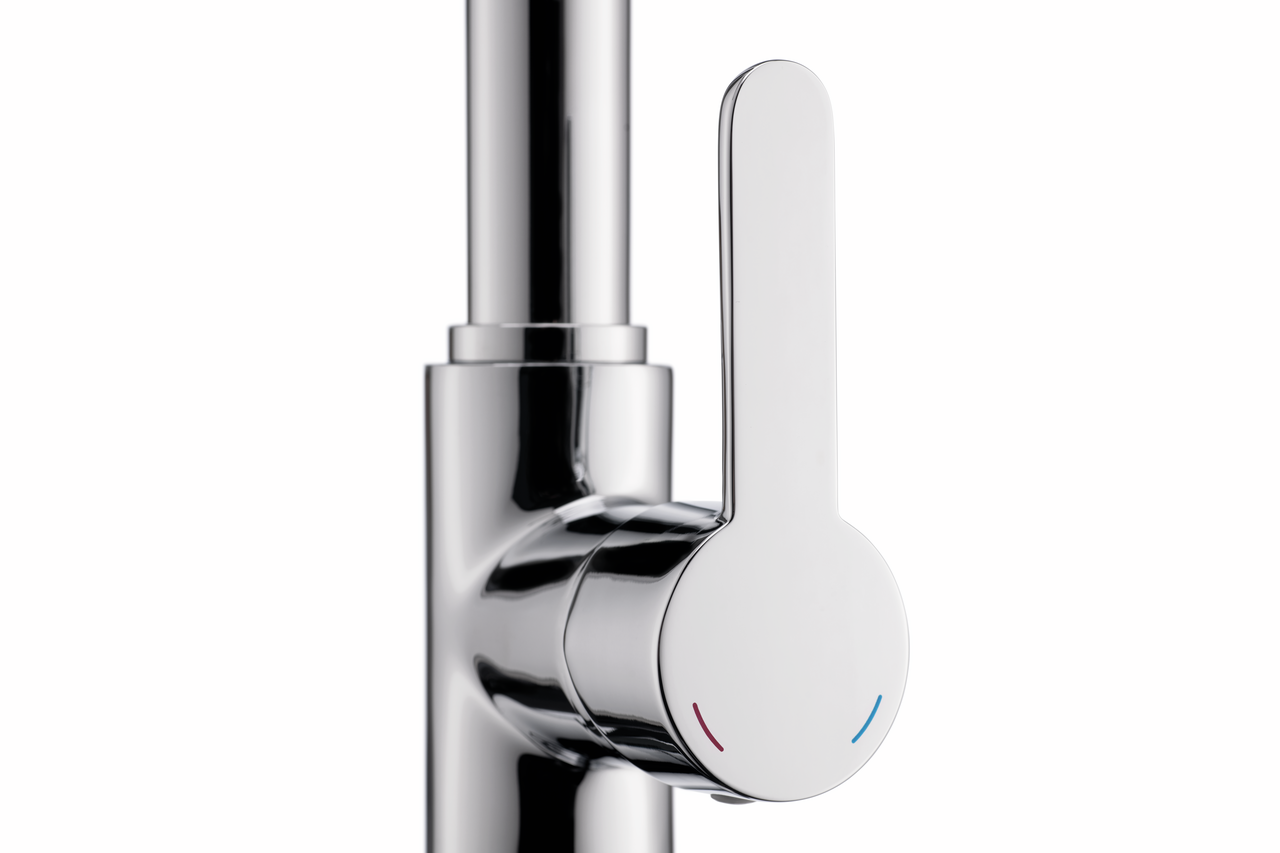 Single lever faucet. With swivelling/pull-out outlet, side lever, ceramic cartridge and scald protection.