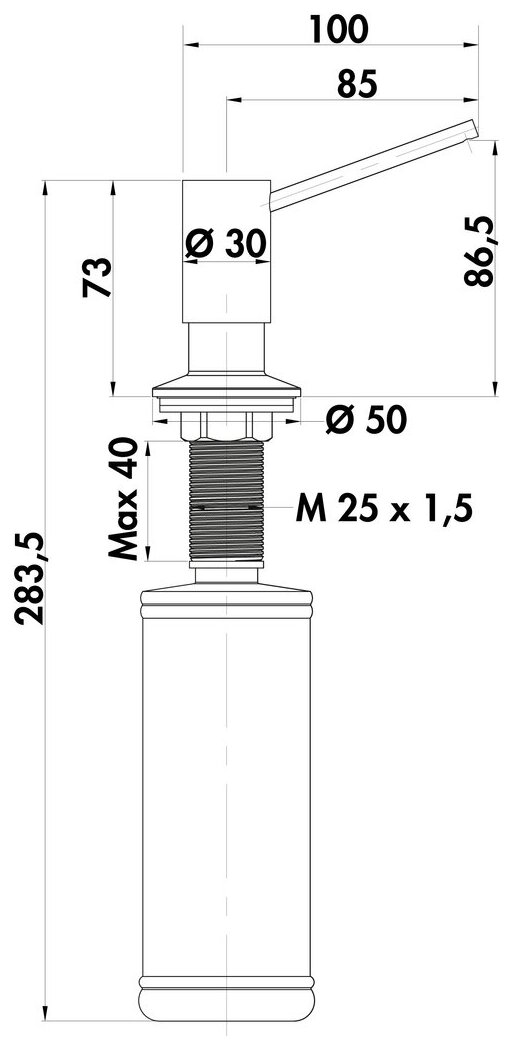 The SERVIZIO Namor® dishwashing liquid dispenser combines functionality and design. With a capacity of 331 ml and a brass pump head, it offers a high-quality, corrosion-resistant metal construction. The dispenser can be installed without tools in worktops with a drilling diameter of 25–40 mm and a worktop thickness of 40 mm. Refilling is easy from above without removing the dispenser. The total installation height is 283.5 mm, with a projection of 85 mm and a spout height of 86.5 mm.