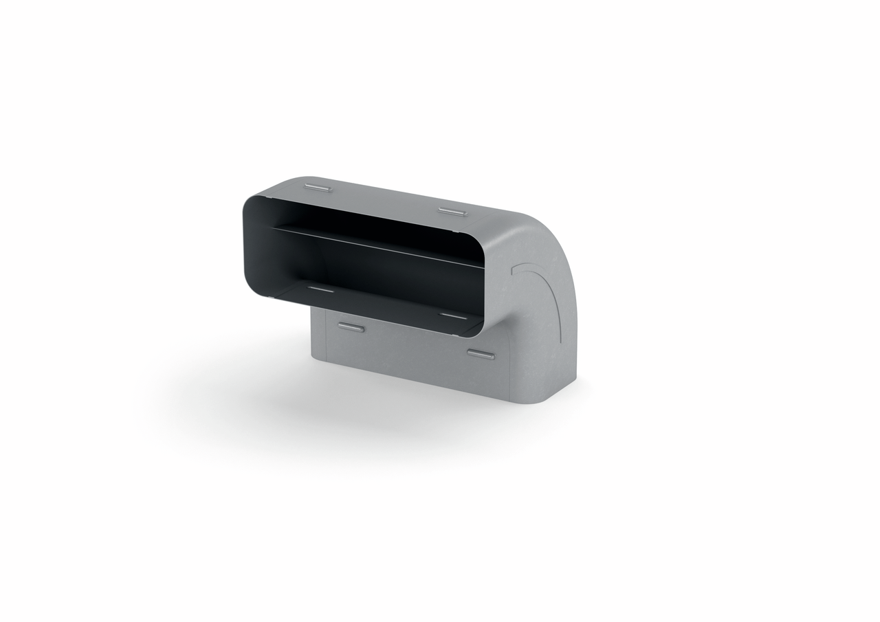 Made of galvanised steel, the COMPAIR® STEEL flow SF-RBV 150 vertical 90° elbow meets even the highest fire protection requirements. Integrated air guide elements ensure an optimised volume flow when passing the exhaust air to the outside. The fitting is compatible with the SF-VRO flex and SF-VRO flat ducts from the series for integration into the ventilation system.