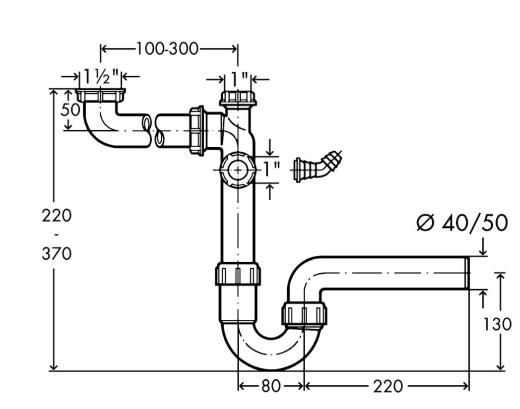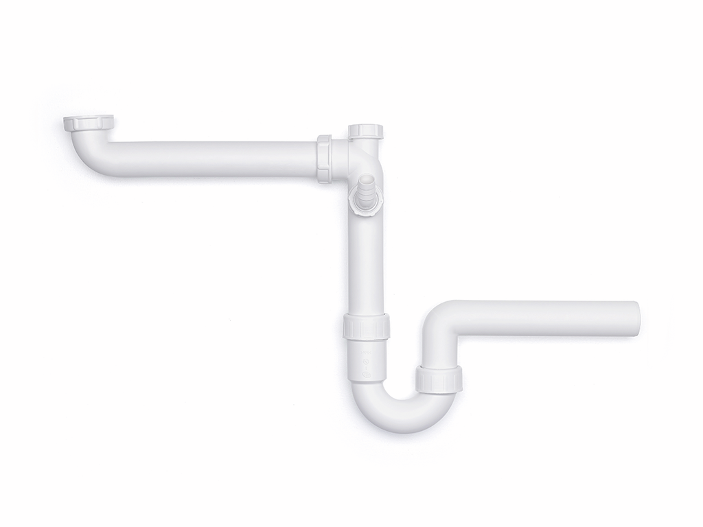 With the space-saving space-saver, the sink can be connected to the drain system in such a way that an under-sink appliance or waste separation can still be installed in the base unit. The siphon is designed without a drain and overflow fitting. The space-saving drain bend provides an additional waste connection for a dishwasher or washing machine with the connection spout. In addition, the kitchen drain offers tested safety according to DIN EN274.
