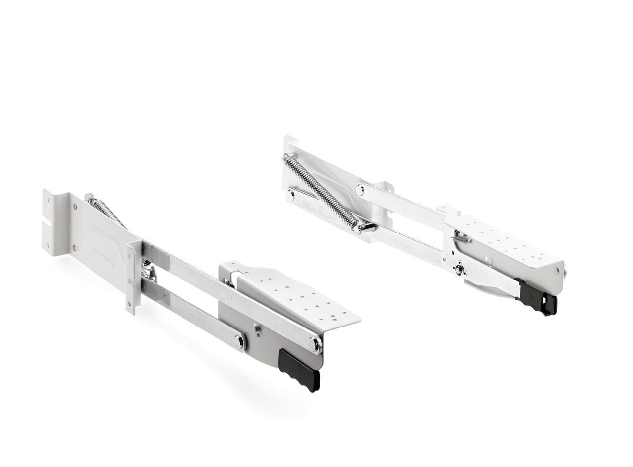 The lift fitting swivel mechanism 1 facilitates the use of particularly large kitchen appliances such as built-in universal cutters. This swivels the appliance parallel-horizontally out of the cabinet and brings it directly to the height of the worktop, with the mechanism supported by the integrated springs... The two-part lift system is well thought-out and of high quality. It provides a load capacity of 8 kg and can be fitted with a matching support plate that serves as a carrier for the unit. It is suitable for any cabinet width. The cabinet equipment is designed for screw mounting on the inner side walls.
