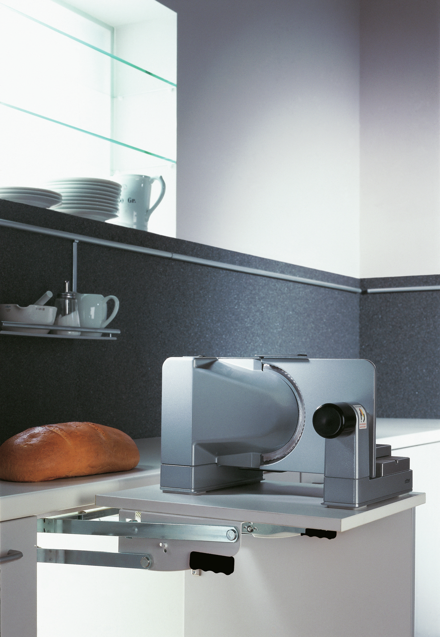 Suitable for any cabinet width, for electric slicer from 450 mm cabinet width. Swings larger appliances stored in the base unit, for instance electric slicers parallel-horizontally to the level of the worktop, by employing two springs.