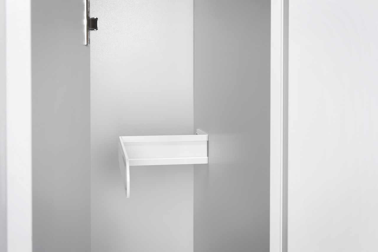 With the Tidy wall holder, the ironing board or household ladder can be attached to the wall unit and stored within easy reach. It is attached to the side of the tall cupboard, allowing the household items to be stored in a space-saving way. The wall holder is made of durable and robust quality powder-coated sheet steel. With its unobtrusive look in white, it blends unobtrusively into the existing furnishing concept.