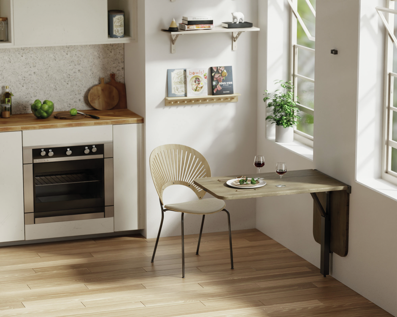 Child-proof ease of use: the TopSwing folding table fitting provides a space-saving, flexible tabletop that can easily be lowered with just one hand. The top slides down smoothly from its vertical position on the wall, with the release mechanism positioned high enough that small children can’t reach it. When opened, the fitting also acts as a table leg. This guarantees legroom and optimum stability.