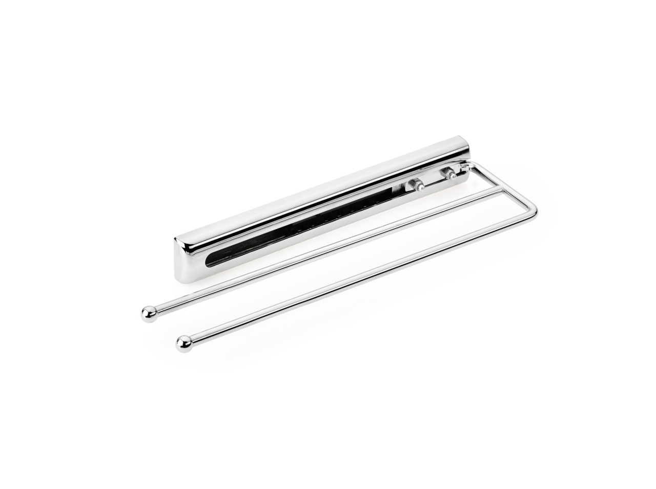With the extendable towel rail for the bathroom, you can create a space-saving and elegant hanging option next to the washbasin. The towel rail can also be used in the kitchen for drying tea towels. It convinces with its elegant design with round ball bar and chrome-plated surface. An integrated cover ensures a decorative overall appearance. It can be attached to the side of the cupboard pull-out or to the carcase. There is a choice of a single- or double-arm version.
