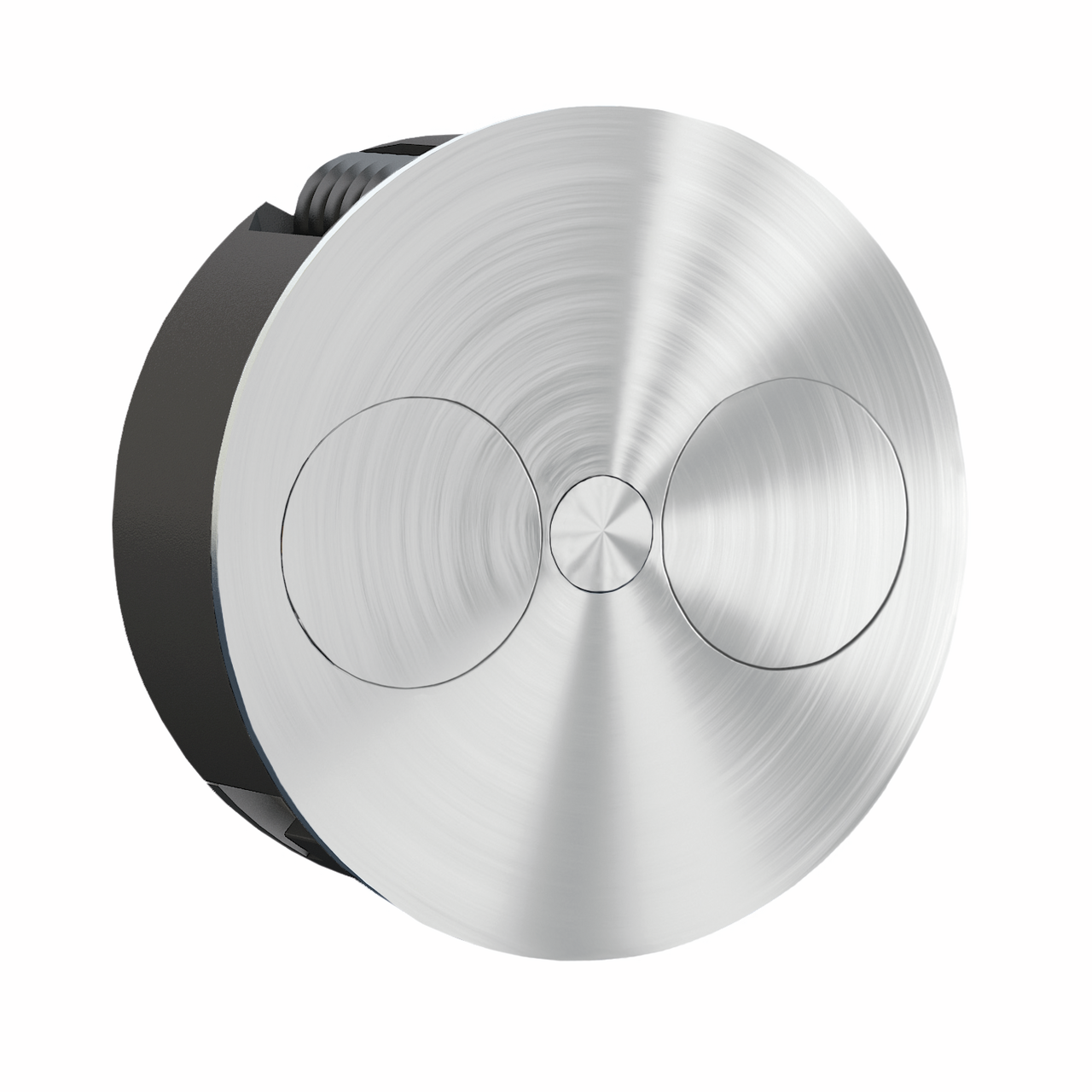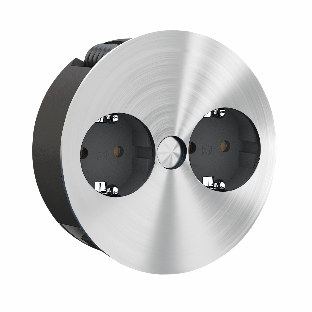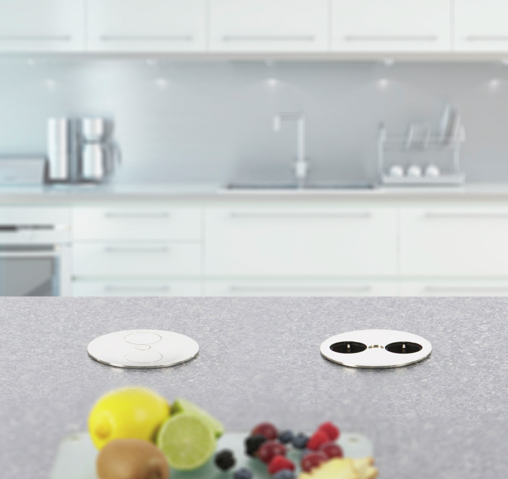 Decorative eye-catcher with practical added value: the CON-AKTIV® Twist built-in socket in an elegant round shape. It provides a striking accent in the area of the worktop and serves as a temporary power supply for various kitchen aids. The double socket outlet is equipped with a rotating cover to allow access to the two sockets with earthing contact. For safety reasons, increased protection against accidental contact is integrated. Thanks to the low installation depth, the double socket outlet can easily be placed above drawers in the kitchen unit. Manufactured in solid quality, the housing is made of plastic, the cover of nickel-plated die-cast zinc with stainless steel-coloured brushed surfaces. The two Schuko plugs are supplied loose. In addition, the set includes a mains connection cable. The cable outlet is located on the side at the bottom. The socket element is optionally available with Belgian-French and Swiss sockets.