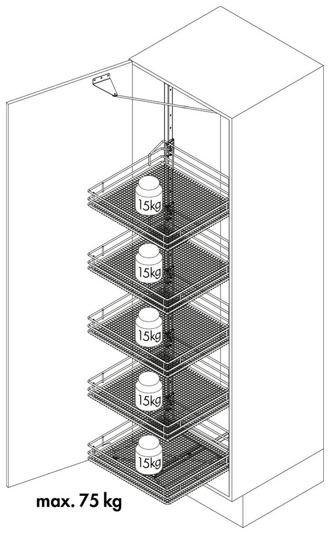The VS TAL Gate telescopic support frame can be used to complete the full-extension runner in storage cabinets. It is part of a clever pull-out system that makes maximum use of the available storage space in the tall cupboard and at the same time allows easy access to the contents. It also ensures a perfect overview. At the same time, the cabinet fitting scores points for convenience and design. It shows its full potential as soon as the kitchen cupboard is opened: the storage material moves outwards in one go. The installation frame is suitable for cabinet widths of 45, 50 and 60 cm. It requires an installation depth of at least 48 cm. The installation height can be varied within a range of 120 to 214 cm, depending on the version. The frame provides individual height adjustment for the baskets. The total load capacity of the pull-out system is 75 kg. Robust materials and a high quality of workmanship are further highlights of the frame. The frame is mounted without tools on the lower and upper guides and on the carrier. It can be carried out on the right or left. The matching guide and the storage baskets are available separately.