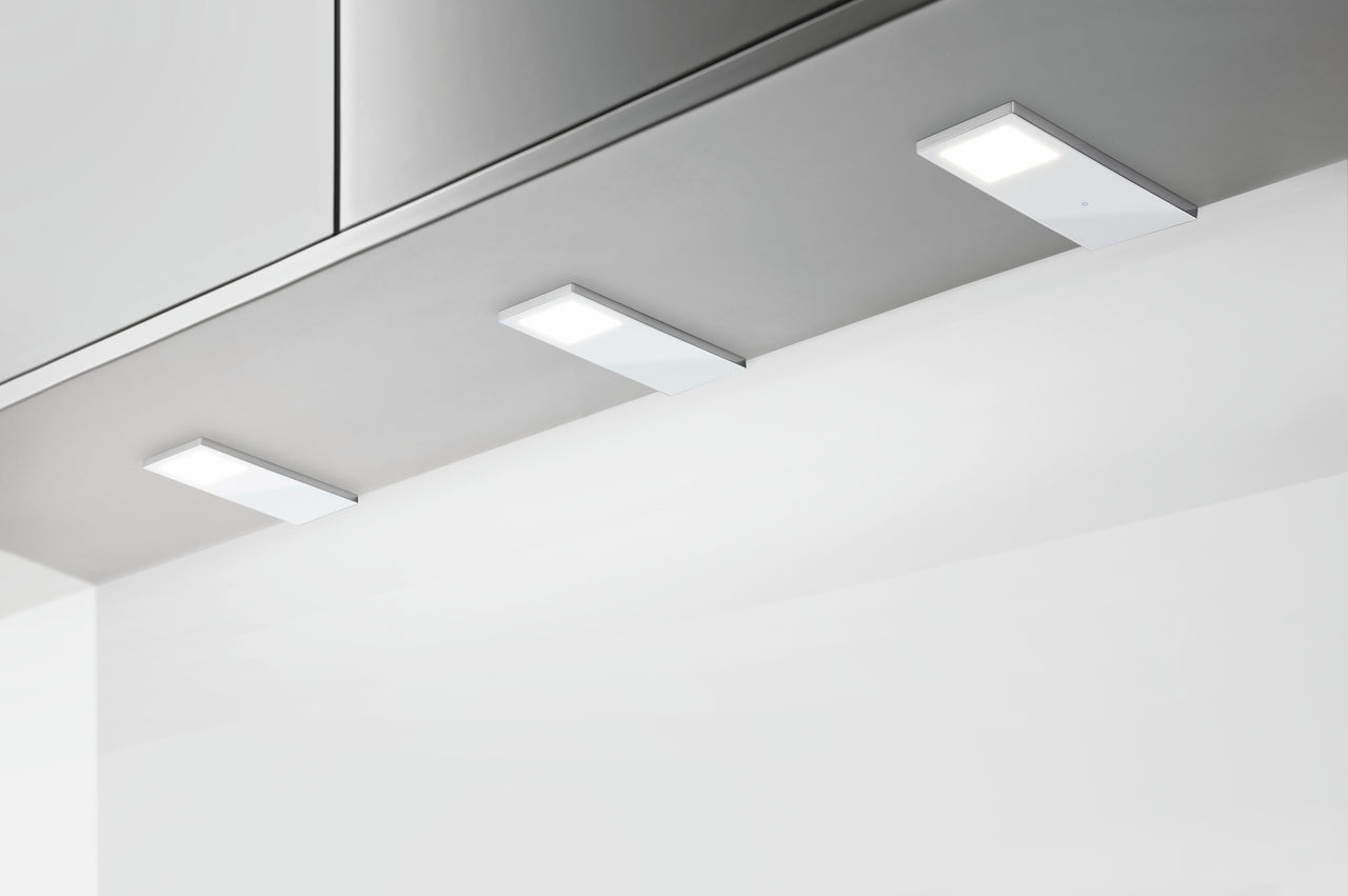 The Vetro LED under-cabinet luminaire elegantly illuminates the work surface. With its timeless modern design, it matches many kitchen interiors. The aluminium housing with glass cover gives the LED luminaire a stylish accent. It is equipped with an LED light source that enables precise light distribution without visible LED points and has energy-saving properties. With its neutral white light colour of 4,000 K, the under-cabinet luminaire provides a pleasant and bright lighting atmosphere. The linear luminaire can optionally be ordered without switch or with LED touch switch and dimmer. The dimming function allows the brightness to be continuously adjusted according to personal preferences. Thanks to the additional memory function, the last setting is saved even after the luminaire is switched off. The niche luminaire is available as a single luminaire or as a set and can be extended to five luminaires.