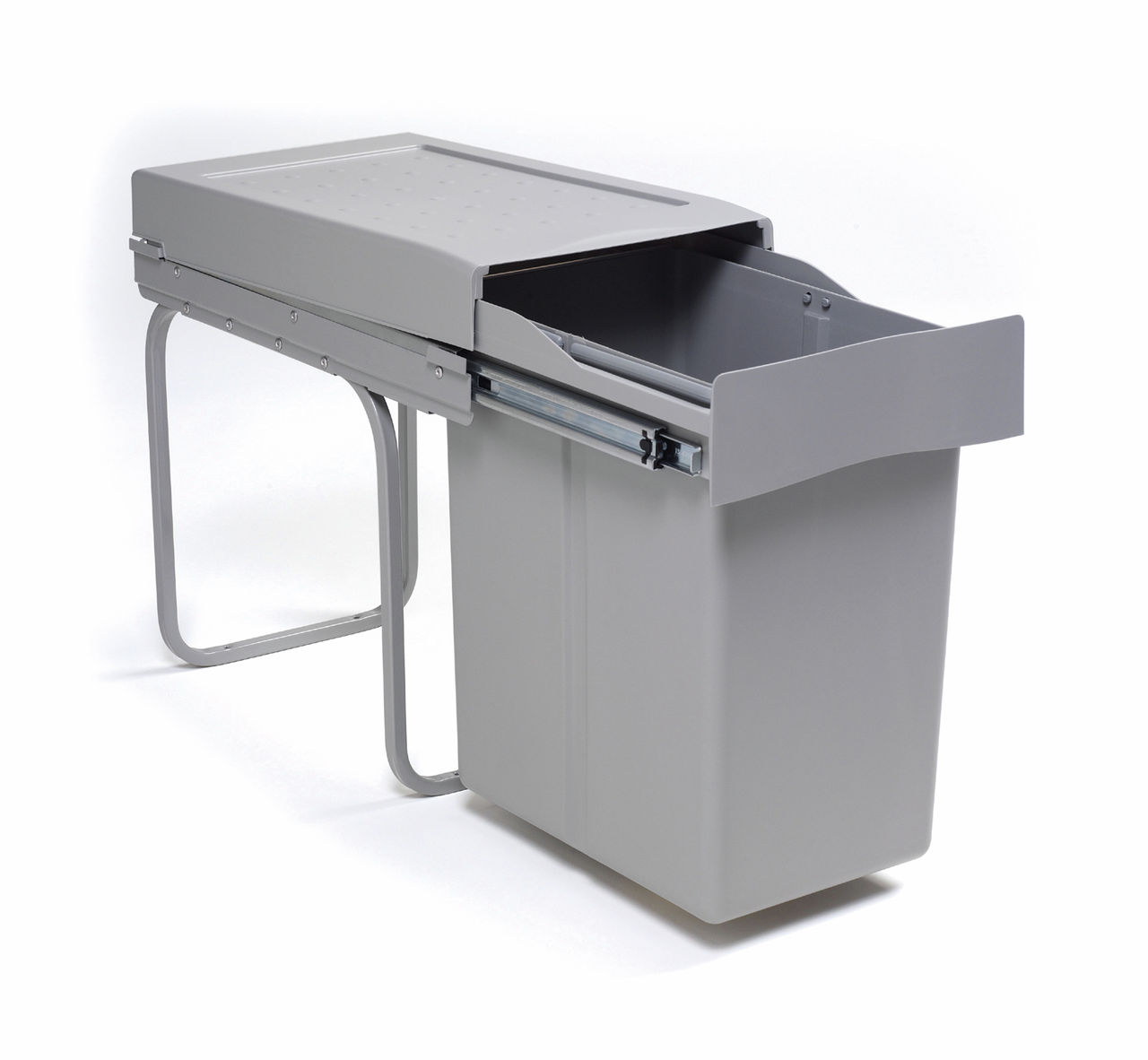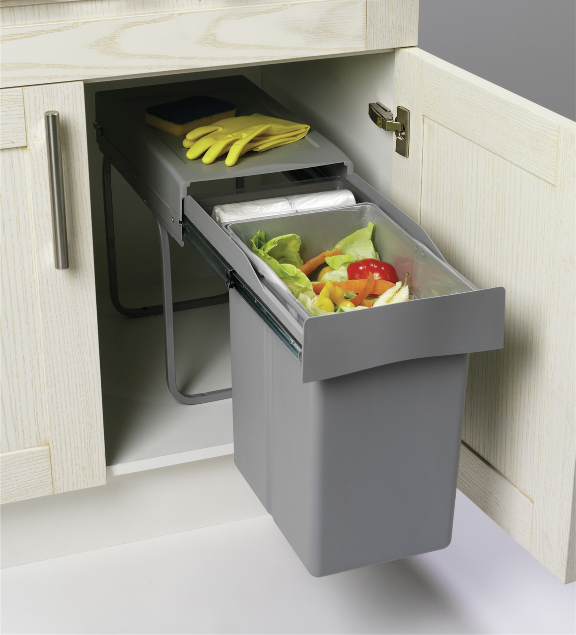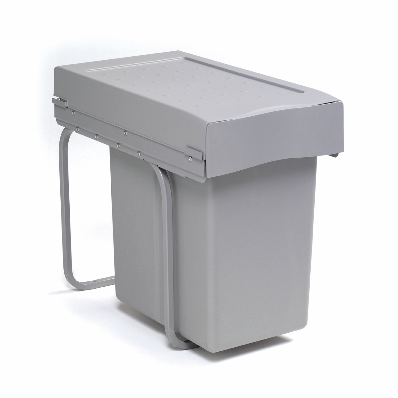 Pull-out built-in waste bin with a 21 litre plastic insert and a practical storage tray. The built-in waste bin is space-saving and can be easily installed in the kitchen base unit.