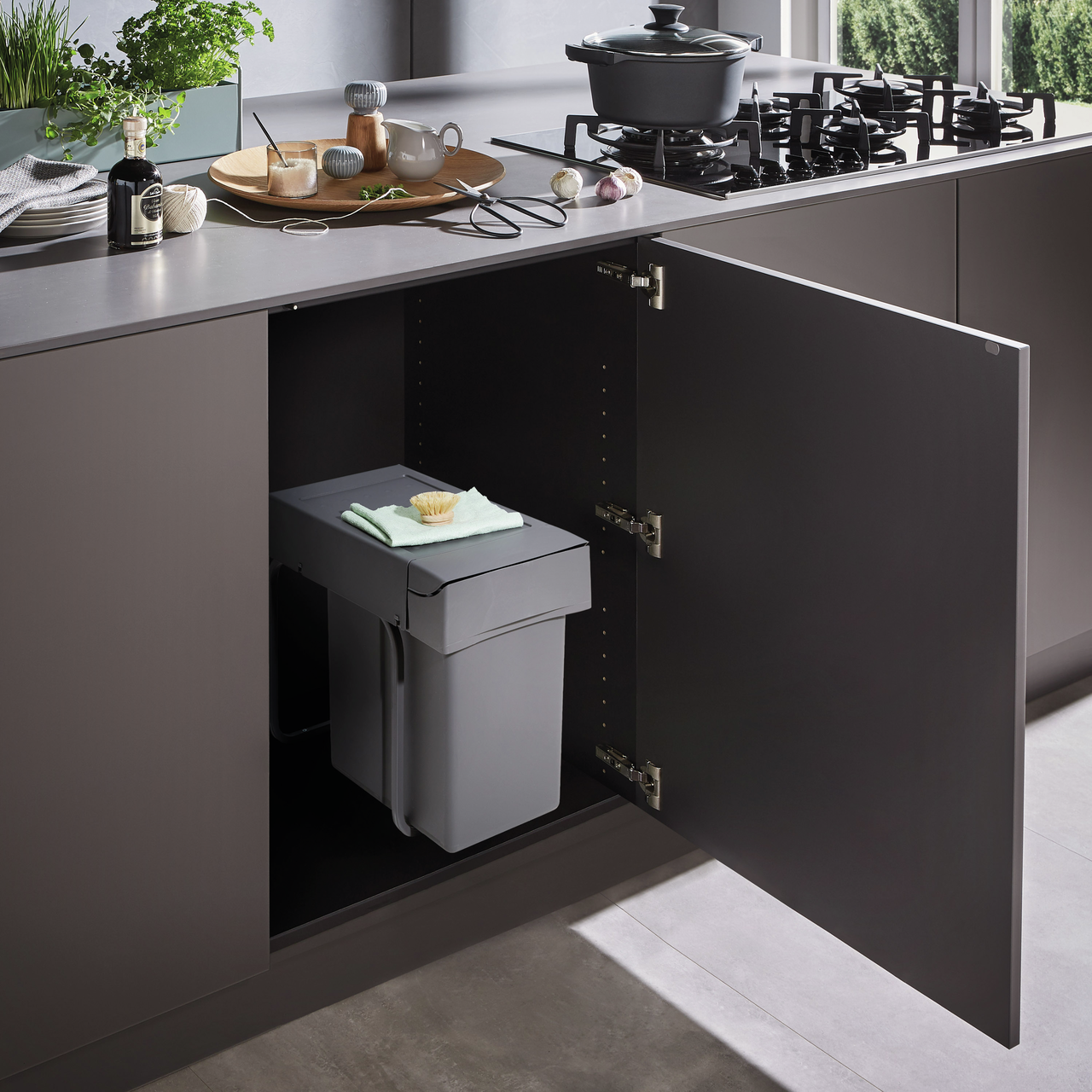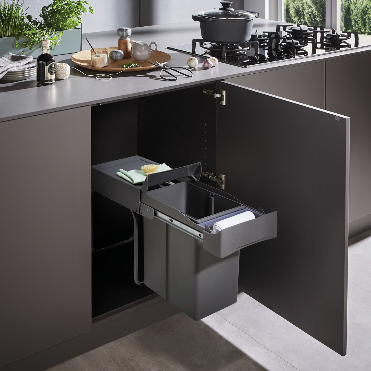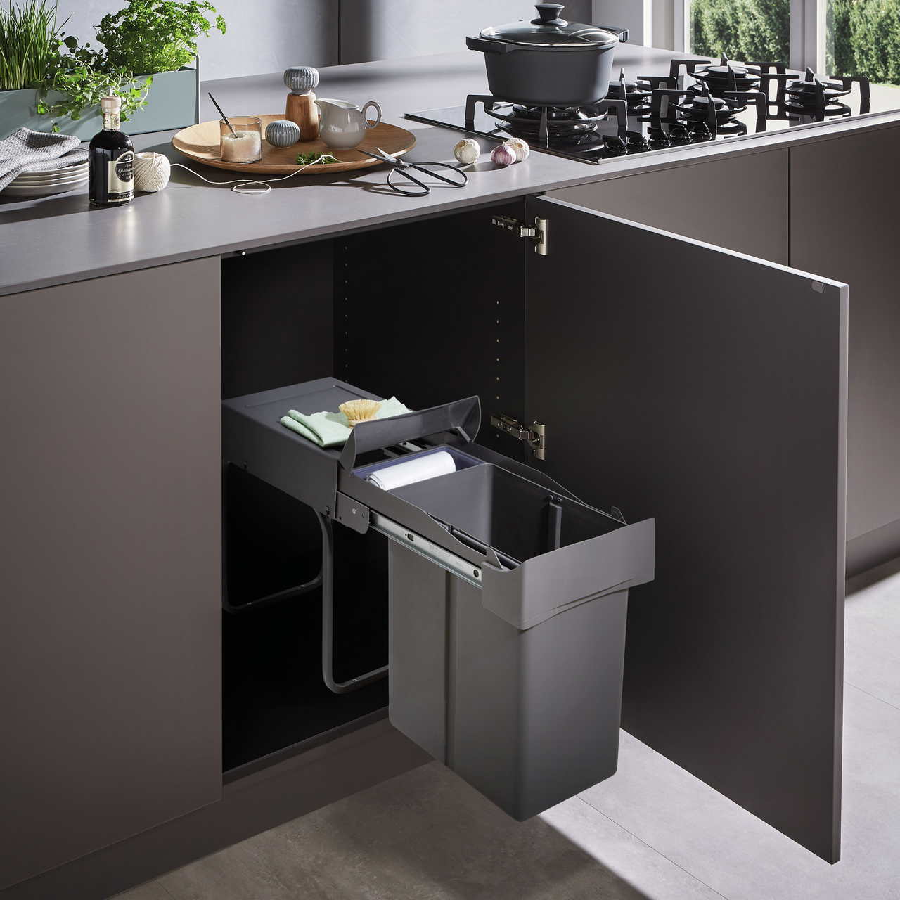 Pull-out built-in waste bin with a 21 litre plastic insert and a practical storage tray. The built-in waste bin is space-saving and can be easily installed in the kitchen base unit.