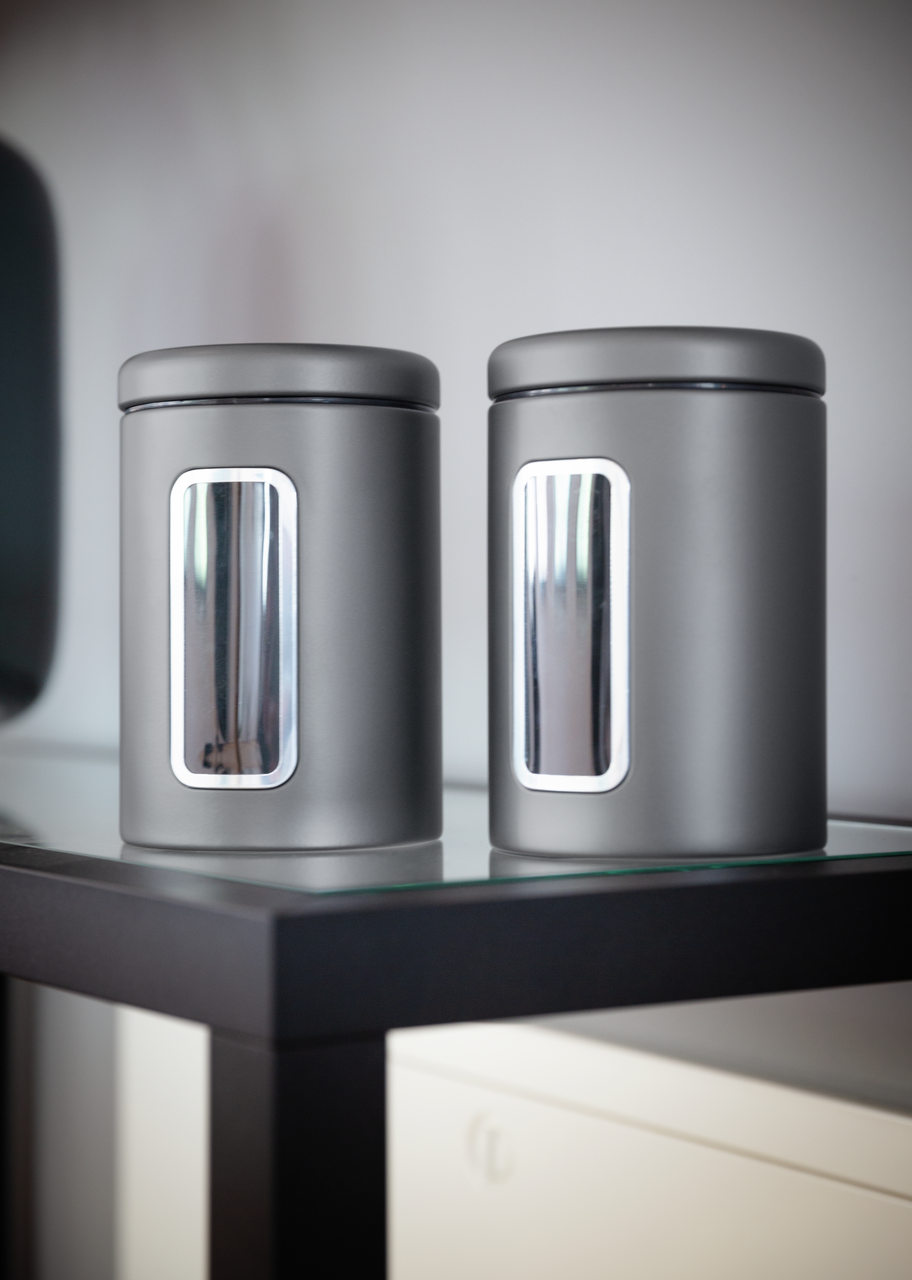 The tin matches the Elly or Single Elly bread box and also the Classic Line cookie box. The metal canister has a tight-fitting lid with embossing and a practical acrylic viewing window. With its 2 litre capacity, it is the perfect storage container for 1 kg of sugar or 500 g of ground coffee. Your favourite muesli or pasta can also be stored in this storage jar.
