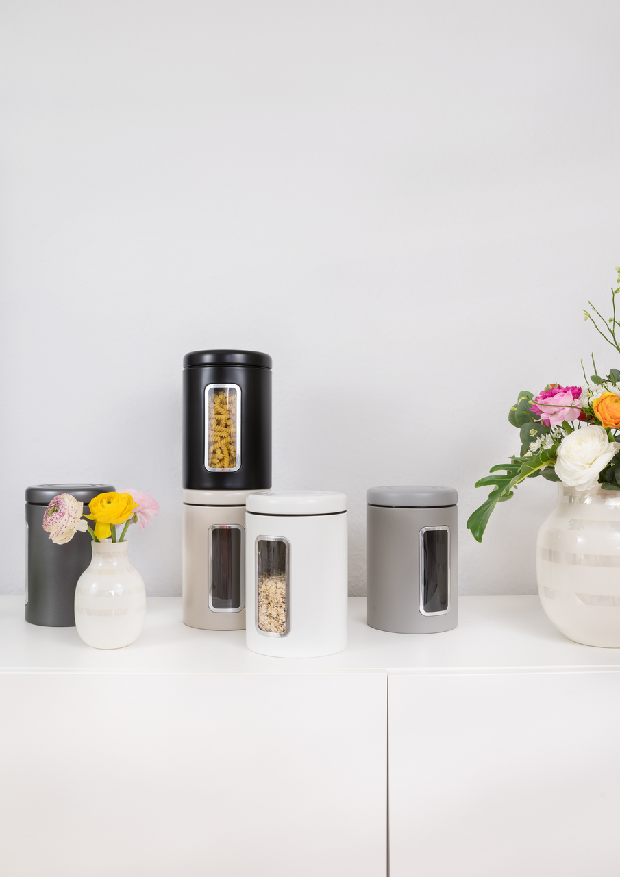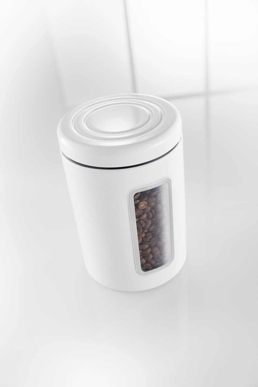 The tin matches the Elly or Single Elly bread box and also the Classic Line cookie box. The metal canister has a tight-fitting lid with embossing and a practical acrylic viewing window. With its 2 litre capacity, it is the perfect storage container for 1 kg of sugar or 500 g of ground coffee. Your favourite muesli or pasta can also be stored in this storage jar.
