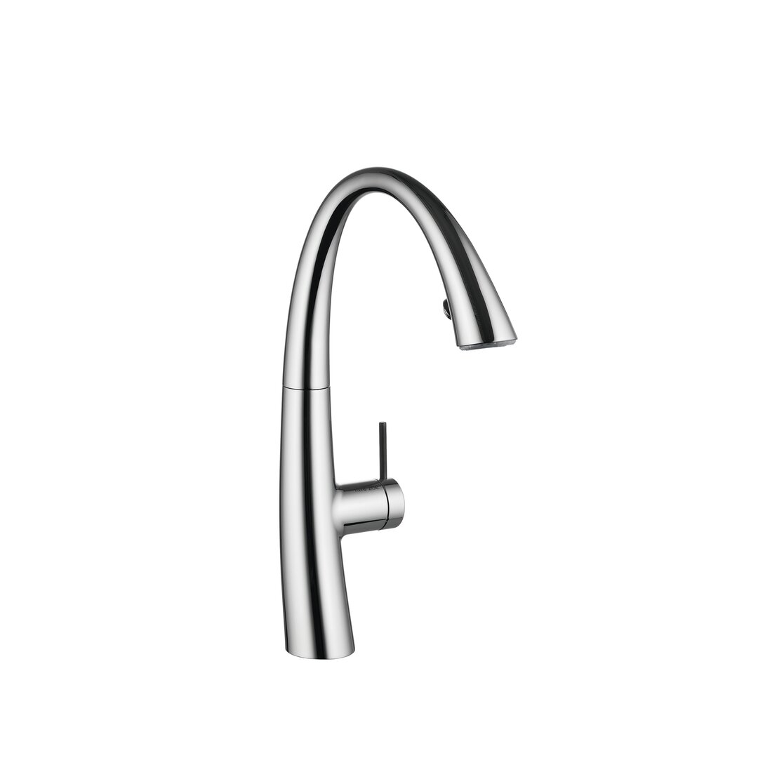 Single lever faucet. With swivelling/pull-out hose with shower head (can be switched to stream or shower) and ceramic cartridge.