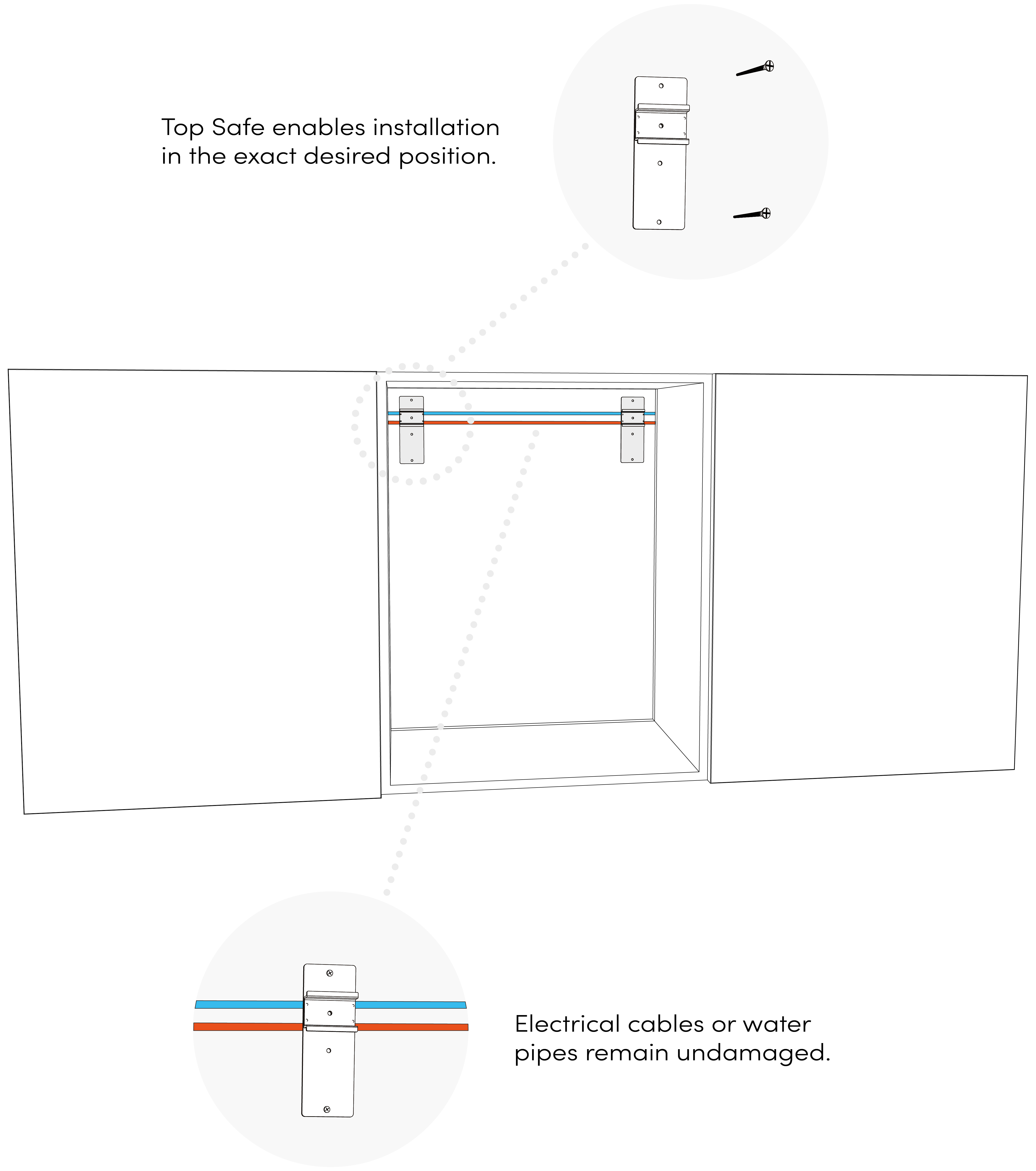 The mounting of wall cabinets in the kitchen and bathroom needs to be secure enough to fulfil the requirements of DIN E1153. Secure mounting is the responsibility of the fitter. This is where Top Safe comes in. The fittings are extremely easy to mount and compatible with most of the cabinet suspension systems available on the market. With Top Safe, transverse electrical cables or water pipes can be easily bridged.