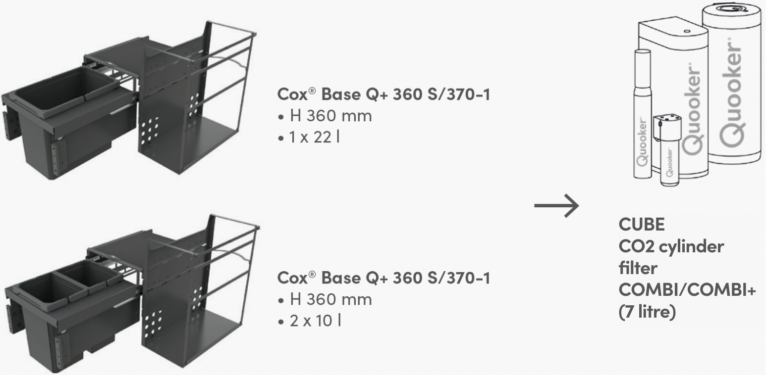 Kettles and soda machines take up valuable space on the worktop. The Quooker® 3l and 7l reservoirs save space as they can be integrated directly into the sink cabinet together with a waste collector. For this, Naber has developed the Cox® Base Q (+). This clever combination with a front pull-out clearly and compactly organises the entire hose and cable management system.