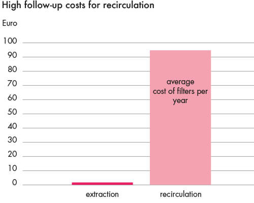 Recirculating air solutions are – with proper maintenance – much more expensive than exhaust air.