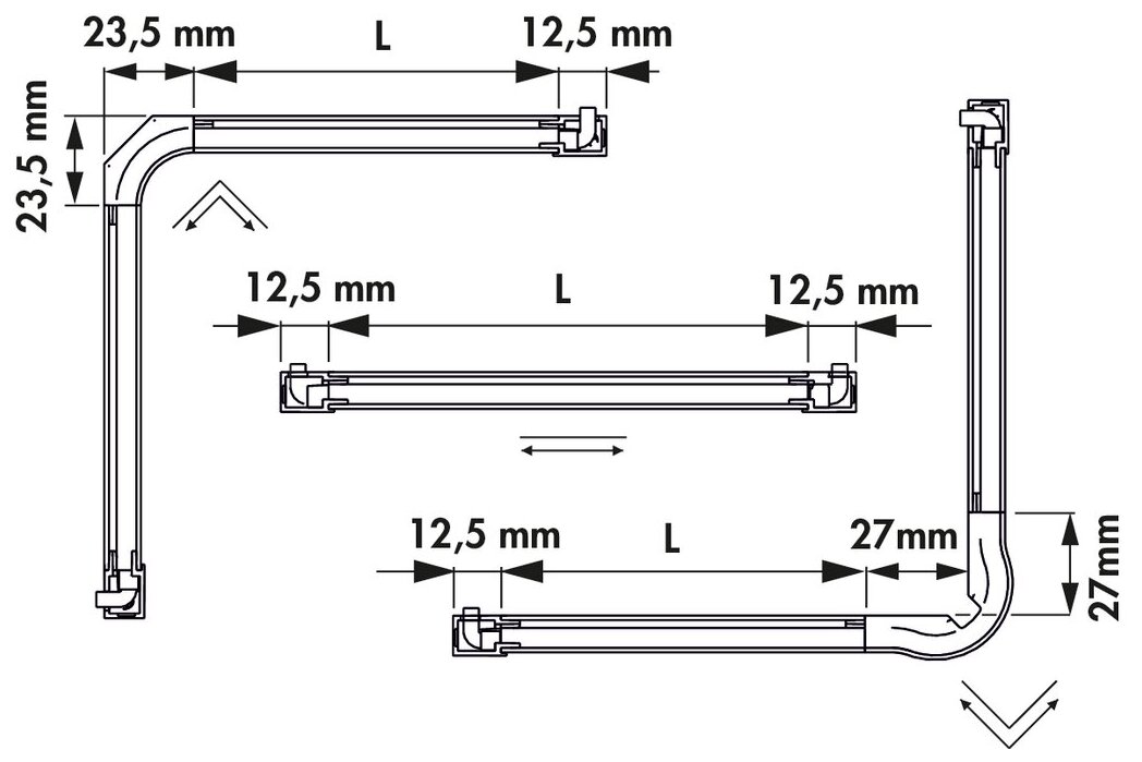 Éclairage des poignées : Boîtier en aluminium avec coins en plastique. Bande LED coulée dans du silicone, non autocollante, raccourcissable tous les 21 mm. Éclairage sans points LED visibles, y compris les clips de fixation pour les poignées.