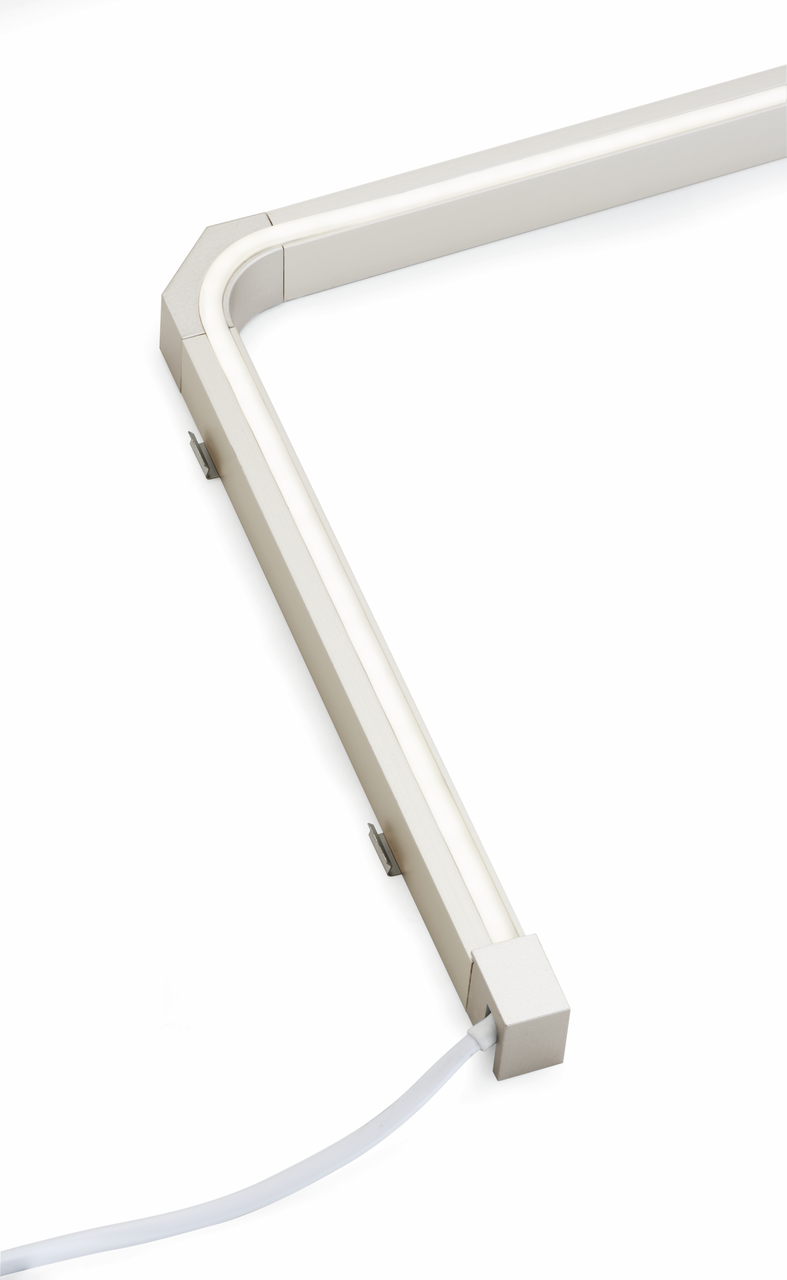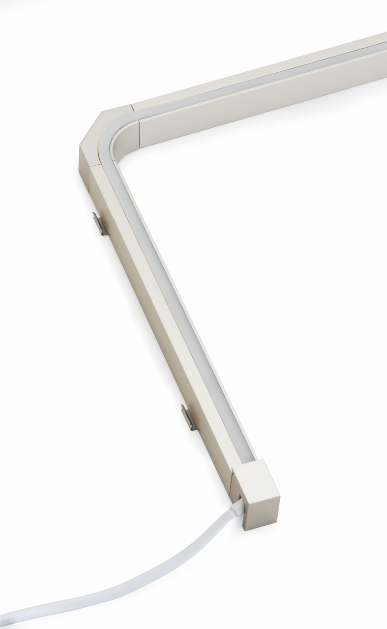 Éclairage des poignées : Boîtier en aluminium avec coins en plastique. Bande LED coulée dans du silicone, non autocollante, raccourcissable tous les 21 mm. Éclairage sans points LED visibles, y compris les clips de fixation pour les poignées.
