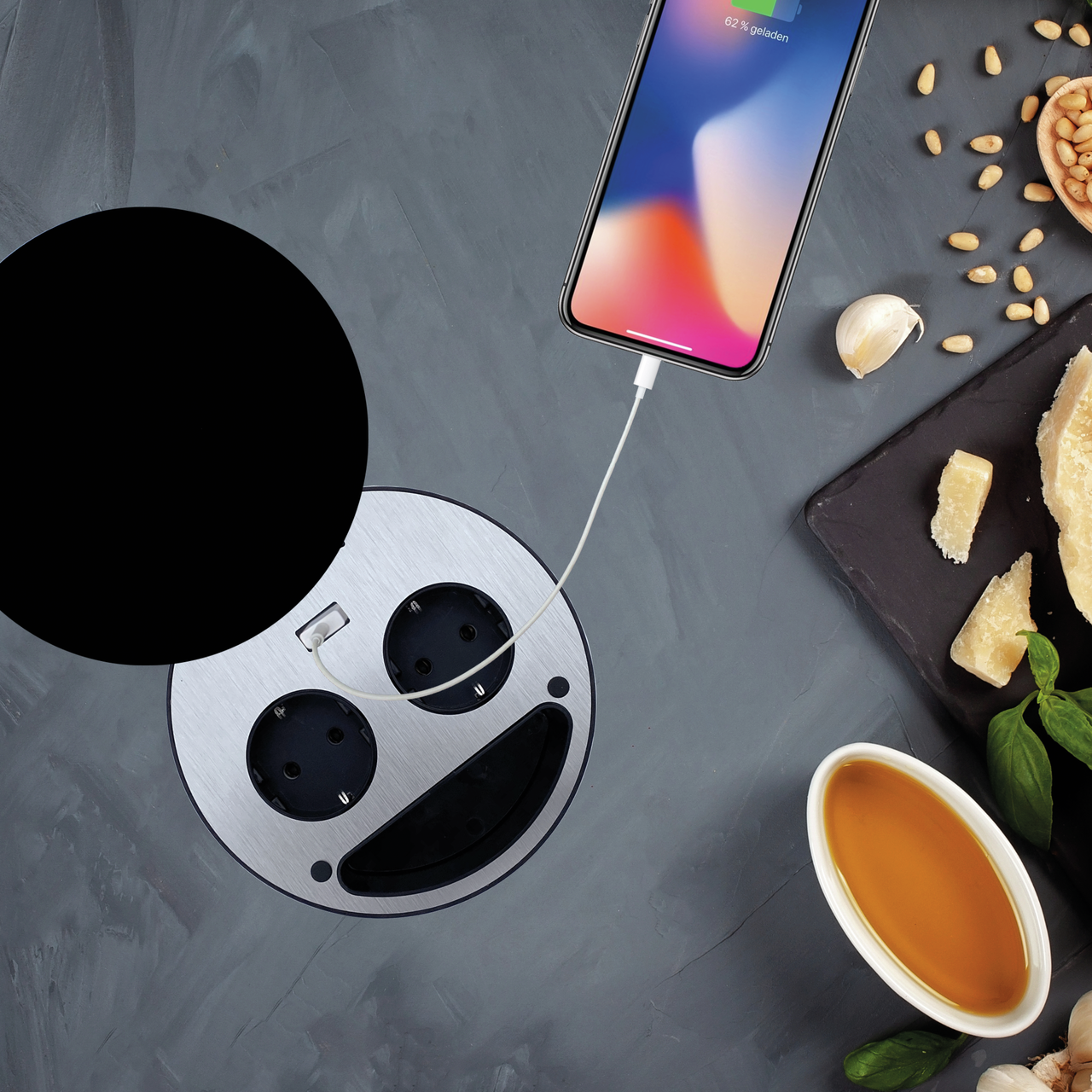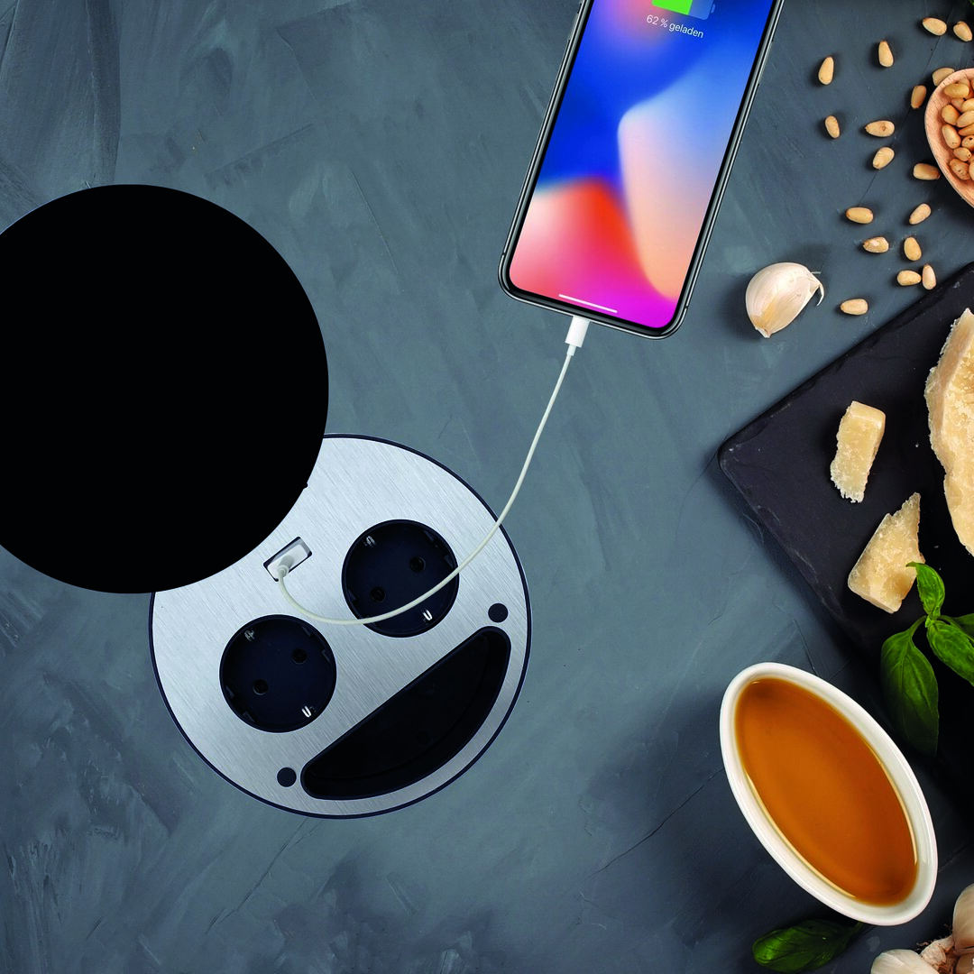 Allie fonctionnalité et design : la prise encastrable CON-AKTIV® Smile USB A est, avec son aspect élégant, une solution stylée pour le raccordement électrique dans la cuisine. Avec son look moderne et arrondi, elle s'intègre dans de nombreux aménagements de cuisine. Pour recharger facilement smartphone et tablette, la double prise dispose d'un chargeur USB A. Les deux prises permettent d'alimenter la bouilloire, le grille-pain et d'autres appareils de cuisine. Point fort : la prise USB est équipée d'un couvercle en verre pivotant et résistant à la chaleur, qui peut être utilisé comme surface pratique pour poser les casseroles chaudes. L'installation de la prise double dans le plan de travail ou le mur arrière est rapide et sans effort. Grâce à sa faible profondeur d'encastrement, elle peut également être installée sans problème au-dessus des tiroirs. L'élément de prise est fabriqué dans une qualité durable et stable avec un boîtier en plastique de haute qualité. La sortie de câble se trouve sur le côté inférieur, ce qui permet de faire passer le câble directement vers le bas.