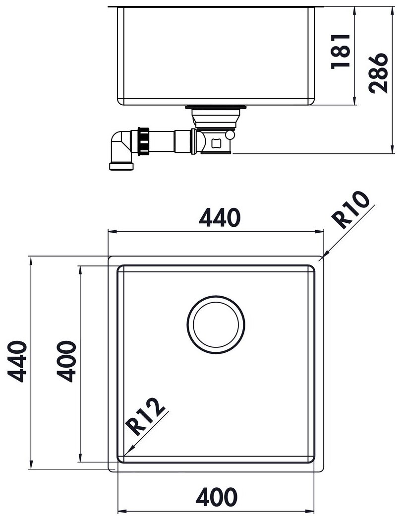 env. 400 x 400 mm (évier à encastrer par le bas), env. 430 x 430 mm (évier encastrable avec bac individuel)