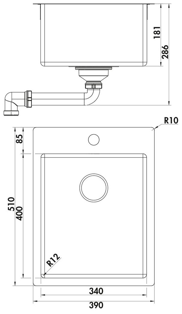Rayon de courbure de l'évier (R):