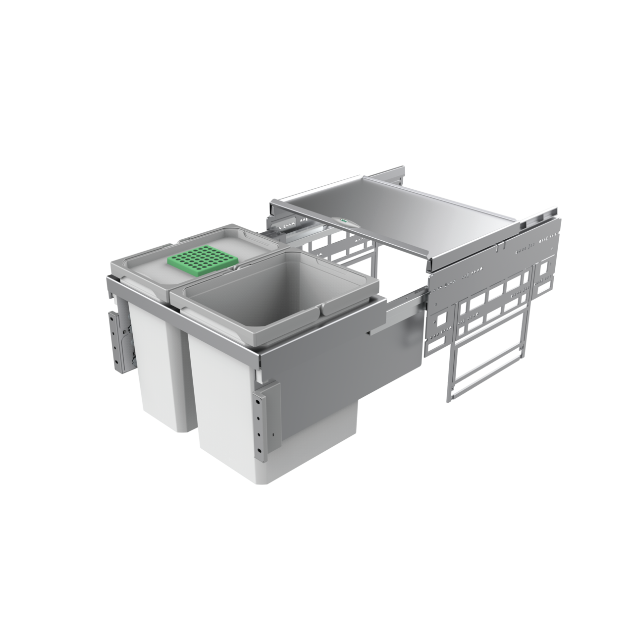 Le système de tri des déchets Cox® Base 360 K/500-2 est le choix idéal pour une cuisine bien organisée et fait du tri des déchets un jeu d'enfant. Grâce à la technique de coulisse intégrée pour les tiroirs à casseroles, il reste élégamment caché dans la ligne de cuisine et n'apparaît que lorsqu'on le sort. Le grand confort d'utilisation est également un avantage : grâce aux rails coulissants faciles à manipuler, la poubelle permet de rentrer et de sortir facilement. Pour que les déchets puissent être facilement séparés, deux poubelles d'une capacité de 15,5 litres et de 12 litres font partie du système de tri des déchets. Le pratique Cox Base-Board® 500 avec deux boîtes de rangement et quatre supports offre un espace de rangement astucieux pour les sacs poubelle, les éponges ou les tablettes de lave-vaisselle par exemple. Grâce à la technique d'extension complète avec retour automatique et amortisseur, la poubelle encastrable se ferme en douceur et de manière autonome. Elle est équipée d'un cadre de montage quick&easy pour une fixation précise et simple sur le mur de l'armoire. Le panneau frontal s'accroche et se monte également facilement dans le cadre coulissant. La poubelle encastrable est disponible en différentes variantes de couleurs.