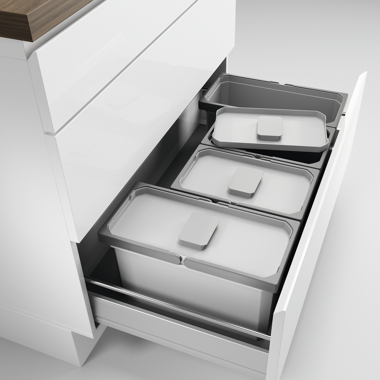 Le système de rangement spacieux Cox® Box 220/900-4 permet de ranger clairement les articles ménagers et les ustensiles de cuisine dans le tiroir de cuisine. L'équipement comprend quatre récipients de rangement de deux tailles différentes : Alors que les deux plus petits récipients ont une capacité de 7,5 litres chacun, les deux plus grands organisateurs offrent un volume de 10 litres chacun. Le système de rangement convient pour les aliments, les produits de nettoyage ou les textiles de cuisine. Des couvercles de fermeture et des biocouvercles adaptés peuvent être commandés en option. Le système est livré avec un tapis antidérapant qui garantit une bonne stabilité dans le tiroir. L'organisateur d'armoires basses est fabriqué dans une qualité supérieure et facile d'entretien. Comme il est disponible en différentes couleurs, il peut être adapté de manière optimale au concept de cuisine existant.