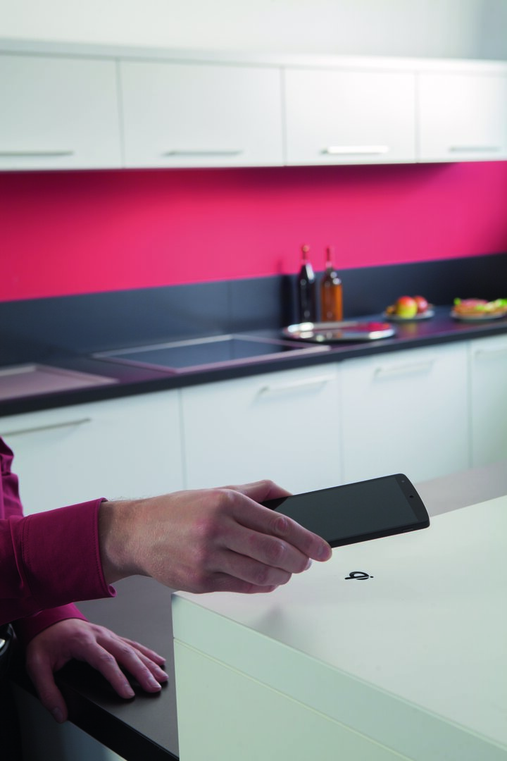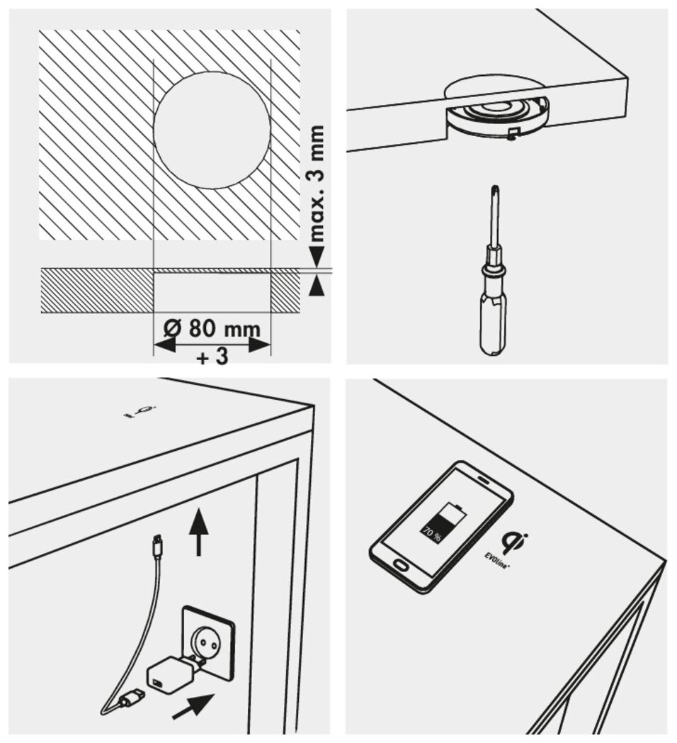 Bobine de charge. Unité de montage Ø 80 mm avec une bobine Qi Wireless. Câble de raccordement au réseau avec adaptateur UE. Pour l’intégration dans le plateau du plan de travail ou pour l’encastrement dans des ouvertures dans la table Ø 80 mm.